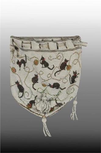 Description Depicting cats. Pull-tie at the top is damaged. Condition (Excellent). Size 7" x 6".