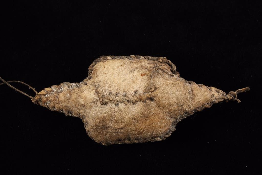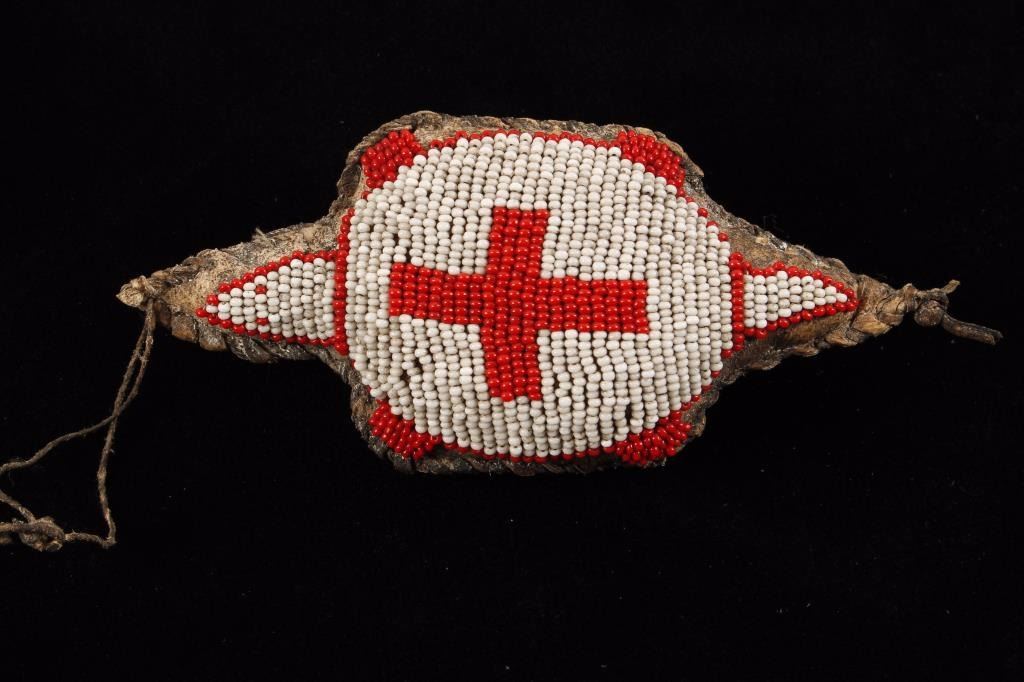Leather construction fully beaded in red and white with cross. Shows age overall good condition.