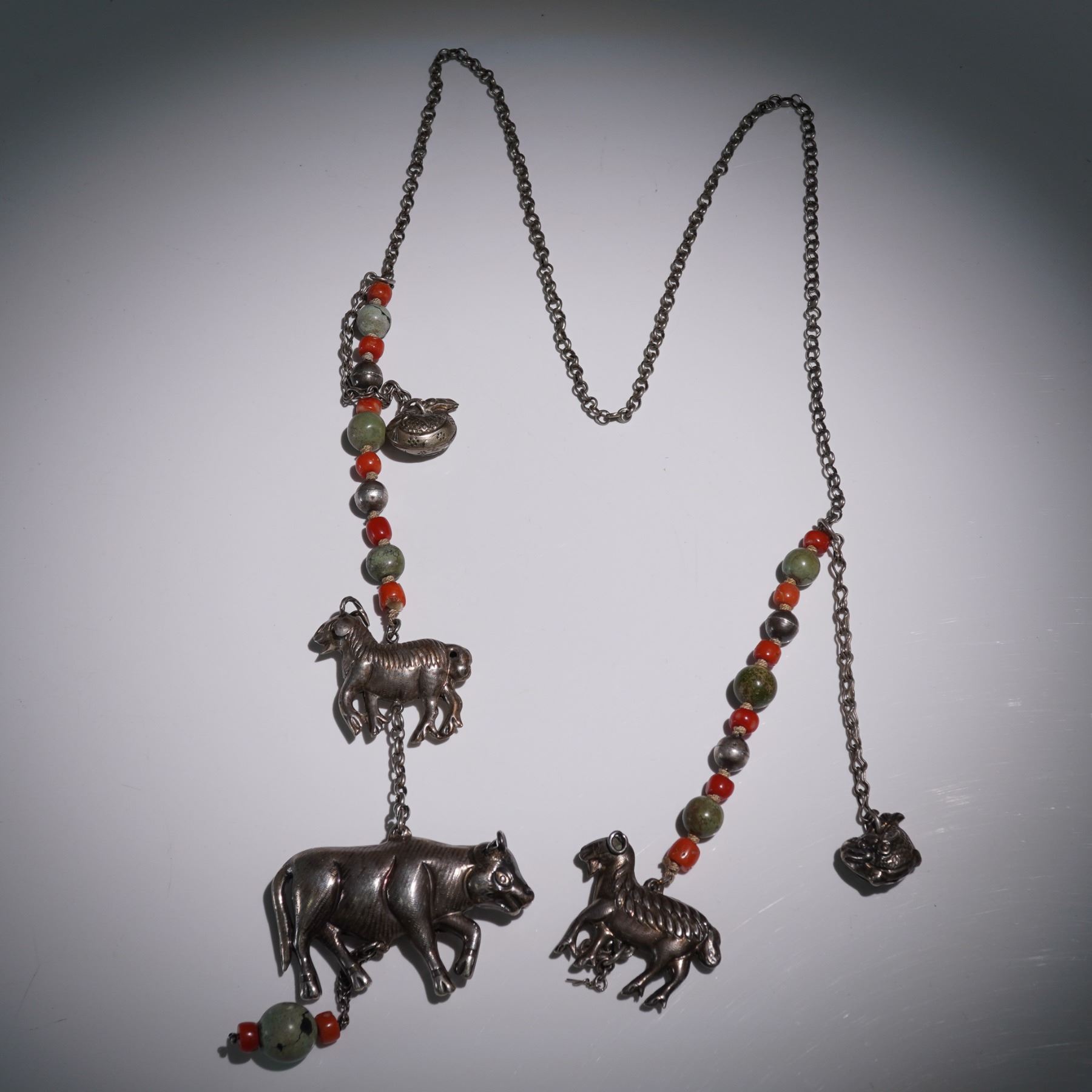 This eclectic beaded strand features detailed cast metal animal and fish charms, including yak, ram, horse, and aquatic motifs. The charms are spaced with polished red and green stone beads and silver-tone accents. Though the piece lacks a clasp and shows signs of prior attachment, it may have originally served as a necklace, amulet strand, or decorative hanging. With its symbolic forms and artisan construction, it reflects Himalayan or Tibetan-inspired folk craftsmanship. A visually engaging and versatile piece open to interpretation.