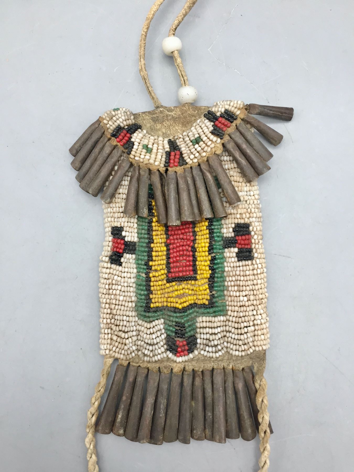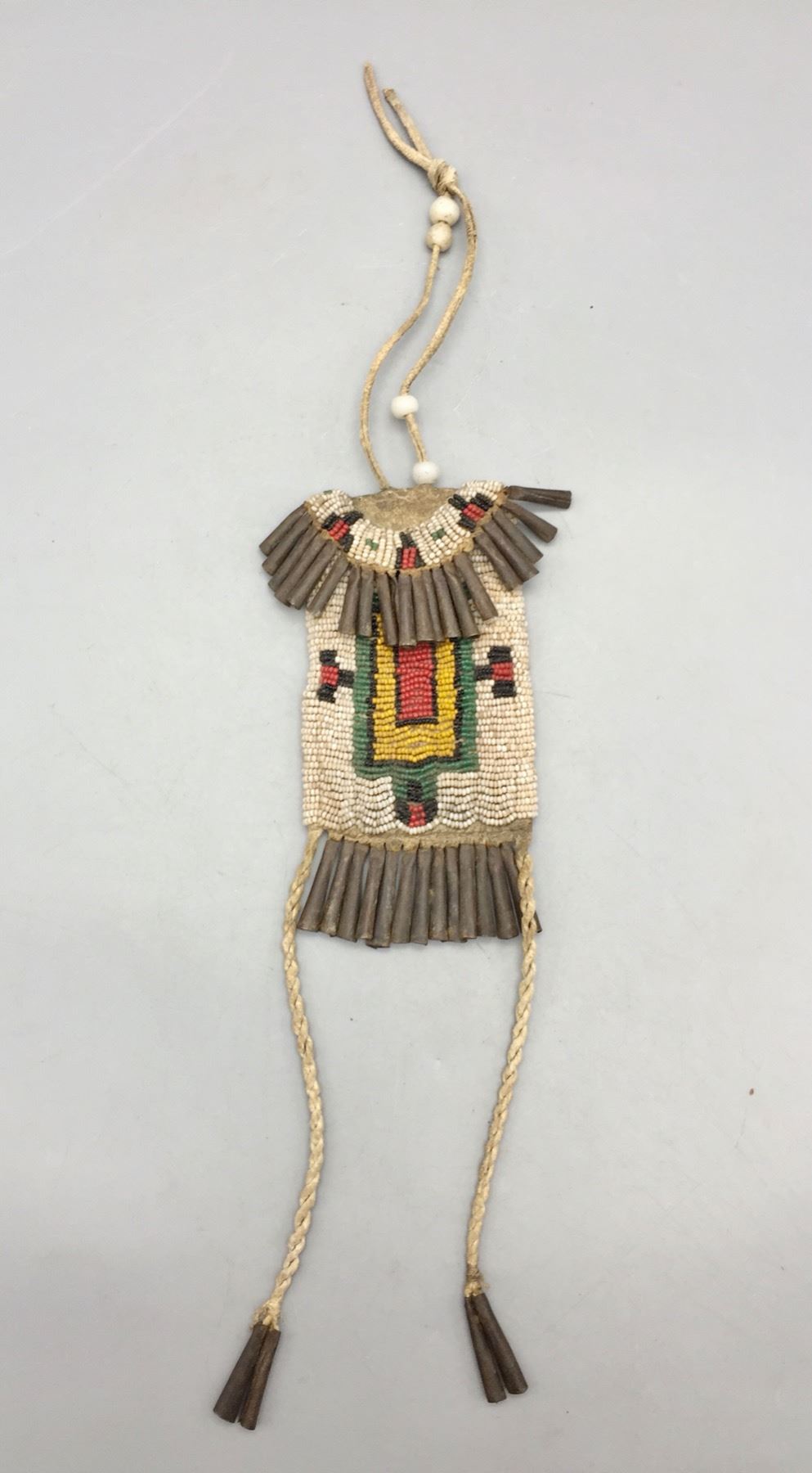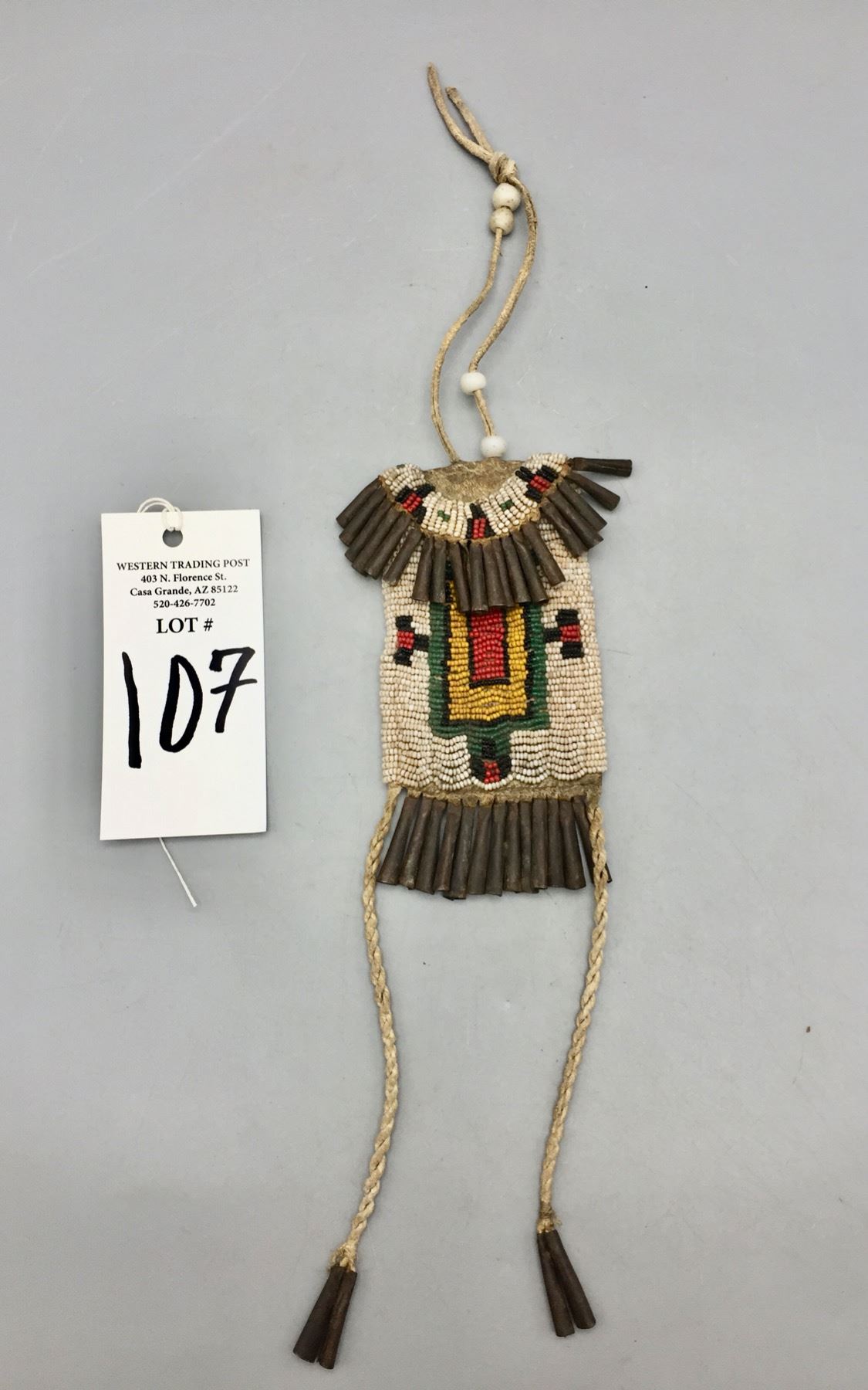 Description: Presented for sale in this lot is a nice old strike-a-lite bag. It features colorful, intricate beadwork using old “greasy” beads, leather accents and handmade jingle cones. It is sinew sewn. Maker: Unknown. Approx. Age: Circa late 19th to early 20th century. Size: 3”w x 16-1/2” long. Condition: Pretty good for its age, some wear and aging expected. Please look closely at the pictures - they are an important part of our description. Shipping: There will be a $7 handling / packaging fee for shipping this lot. The actual cost of postage will be added on top of that.