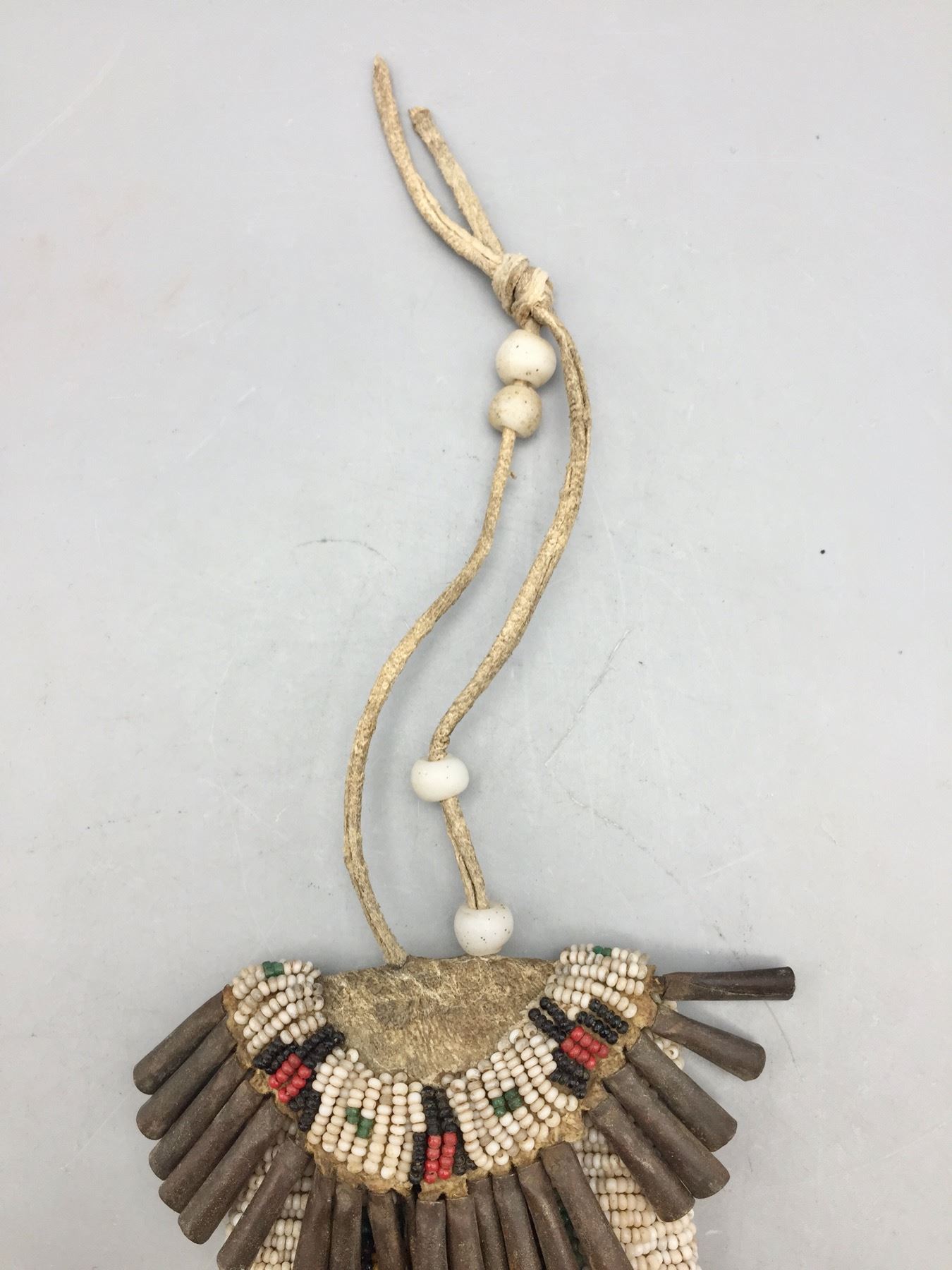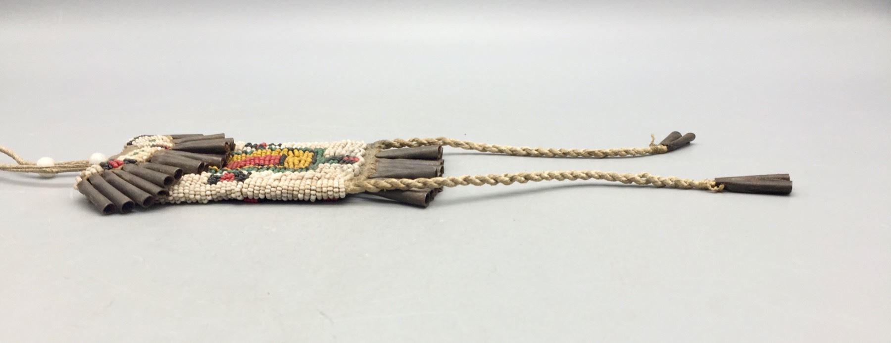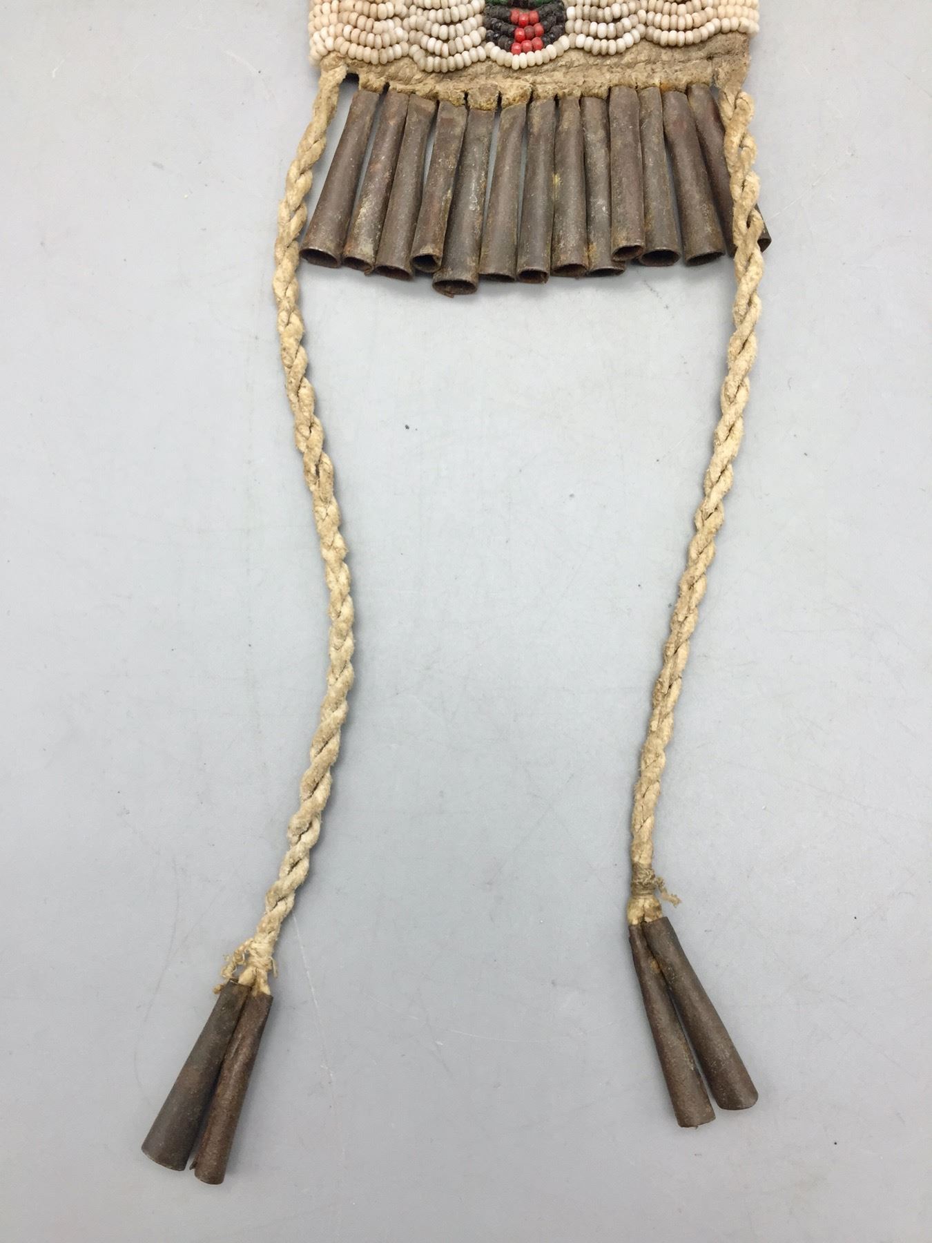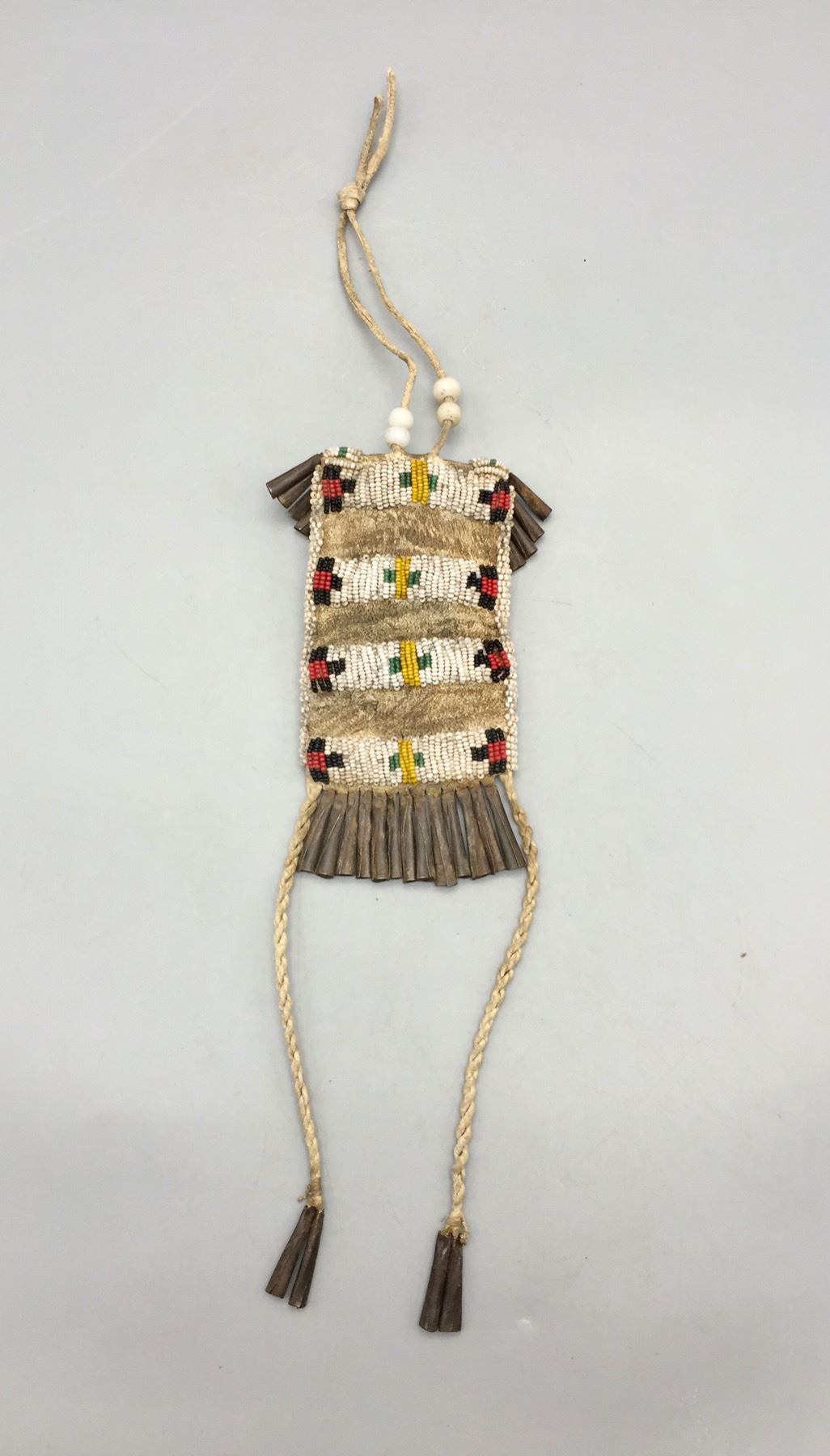 Description: Presented for sale in this lot is a nice old strike-a-lite bag. It features colorful, intricate beadwork using old “greasy” beads, leather accents and handmade jingle cones. It is sinew sewn. Maker: Unknown. Approx. Age: Circa late 19th to early 20th century. Size: 3”w x 16-1/2” long. Condition: Pretty good for its age, some wear and aging expected. Please look closely at the pictures - they are an important part of our description. Shipping: There will be a $7 handling / packaging fee for shipping this lot. The actual cost of postage will be added on top of that.