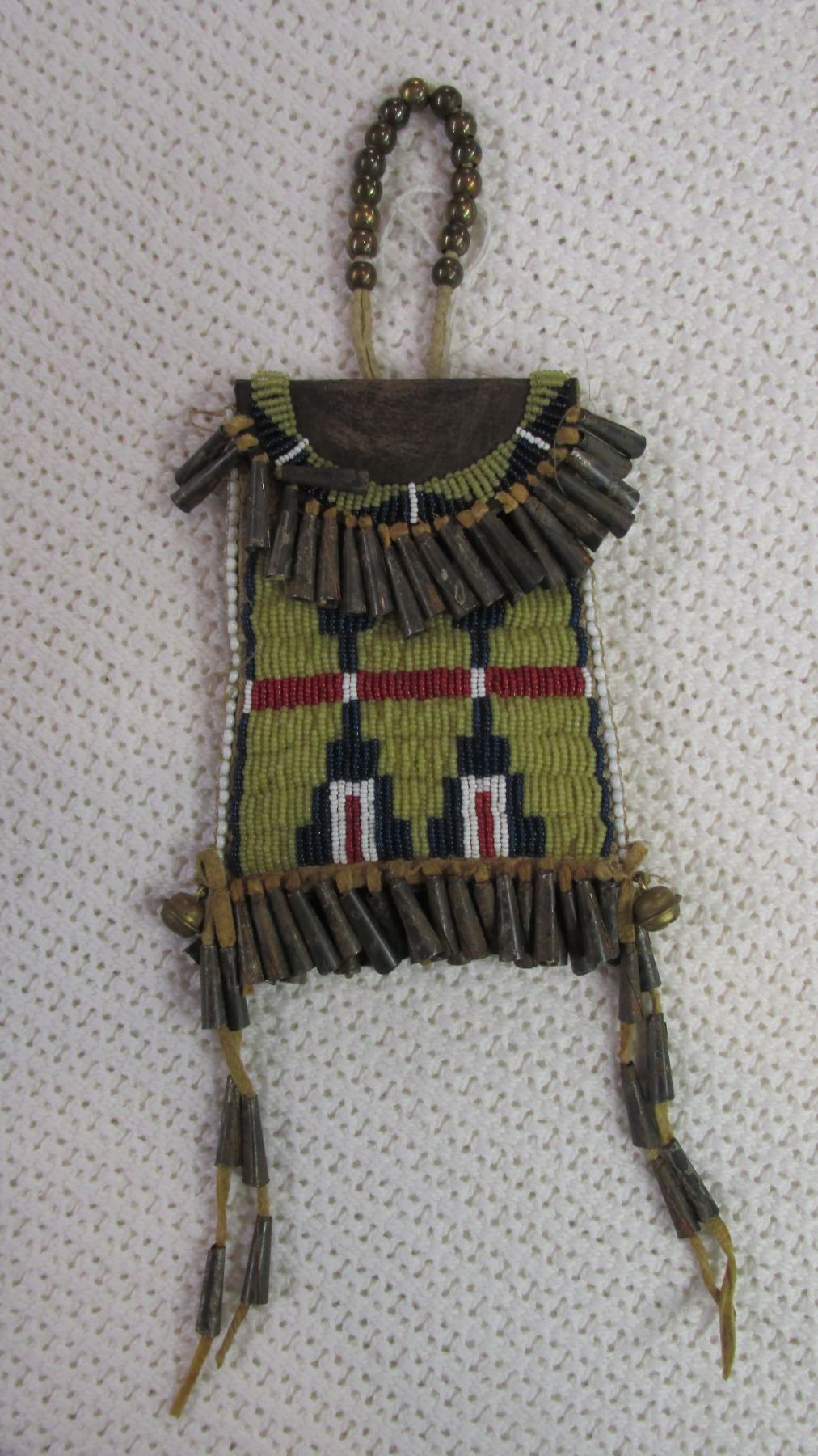 Nice beaded Strike A Lite Bag. Made with heavy saddle leather and beaded on brain tanned buckskin. Has tin cones on bottom and on beaded top flap.