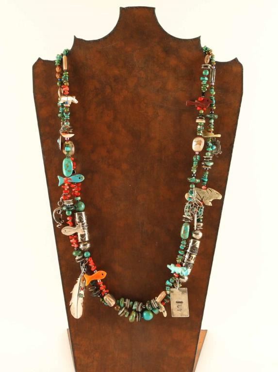 Turquoise, coral and lapis beads with animal fetishes and treasures in sterling silver of a dreamcatcher, Kokopelli, feather, barrel beads and more. Approx. 30" long.