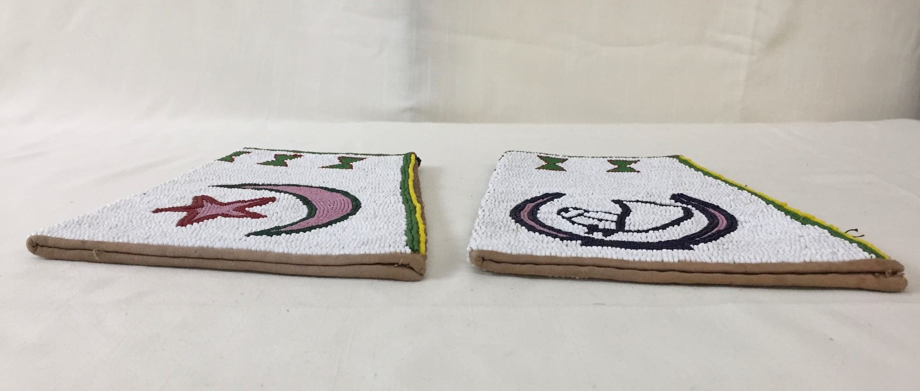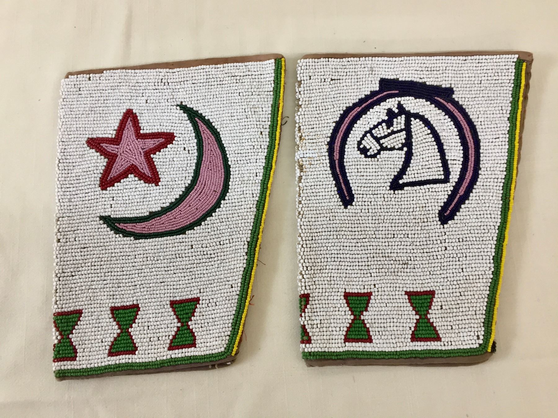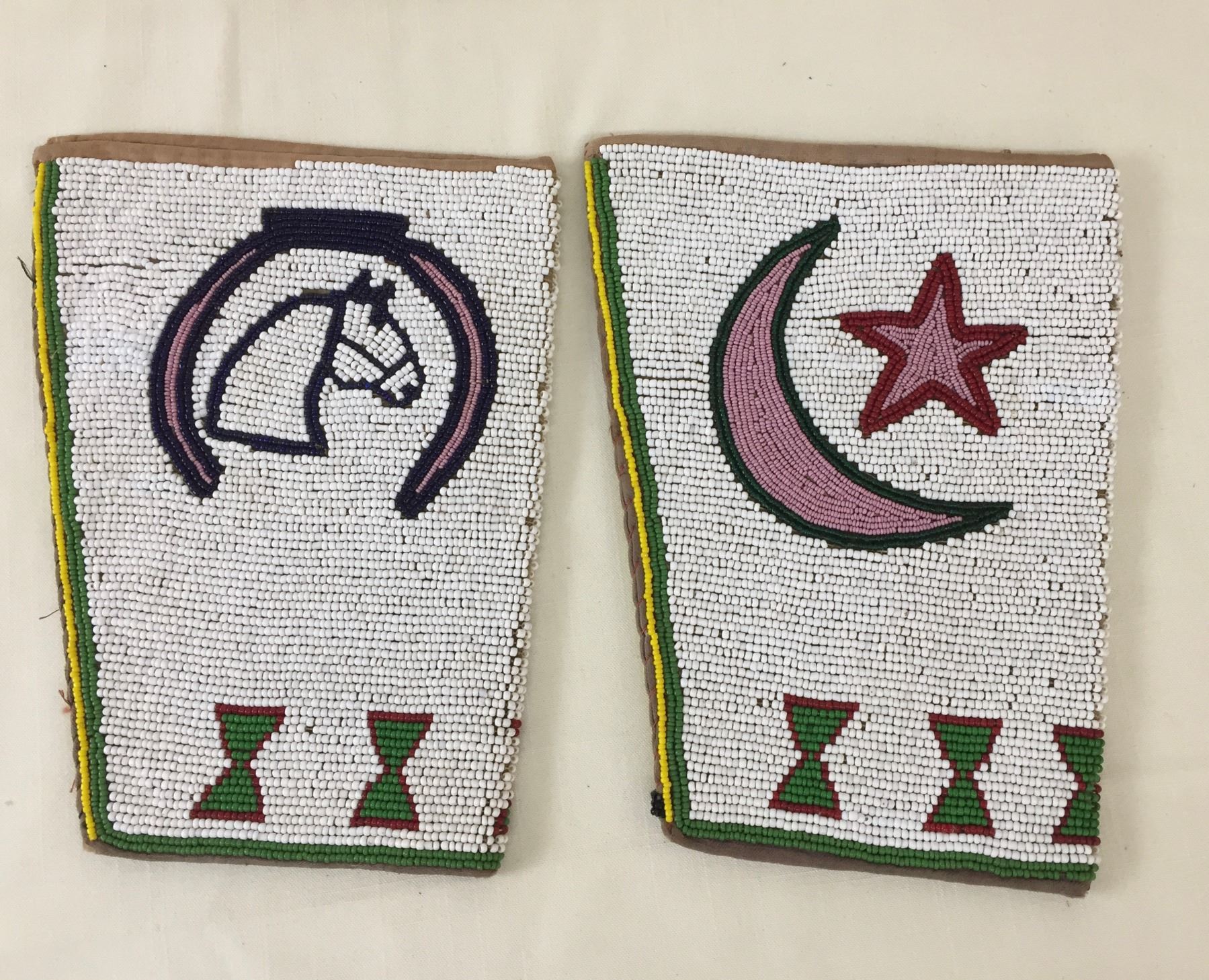 Description: For your pleasure we offer this beautiful set of beaded wrist cuffs featuring intricate beaded designs in the likeness of the moon and a star, and a horse with a horseshoe. Maker: Unknown Plains Native American bead artist. Approx. Age: Vintage.
