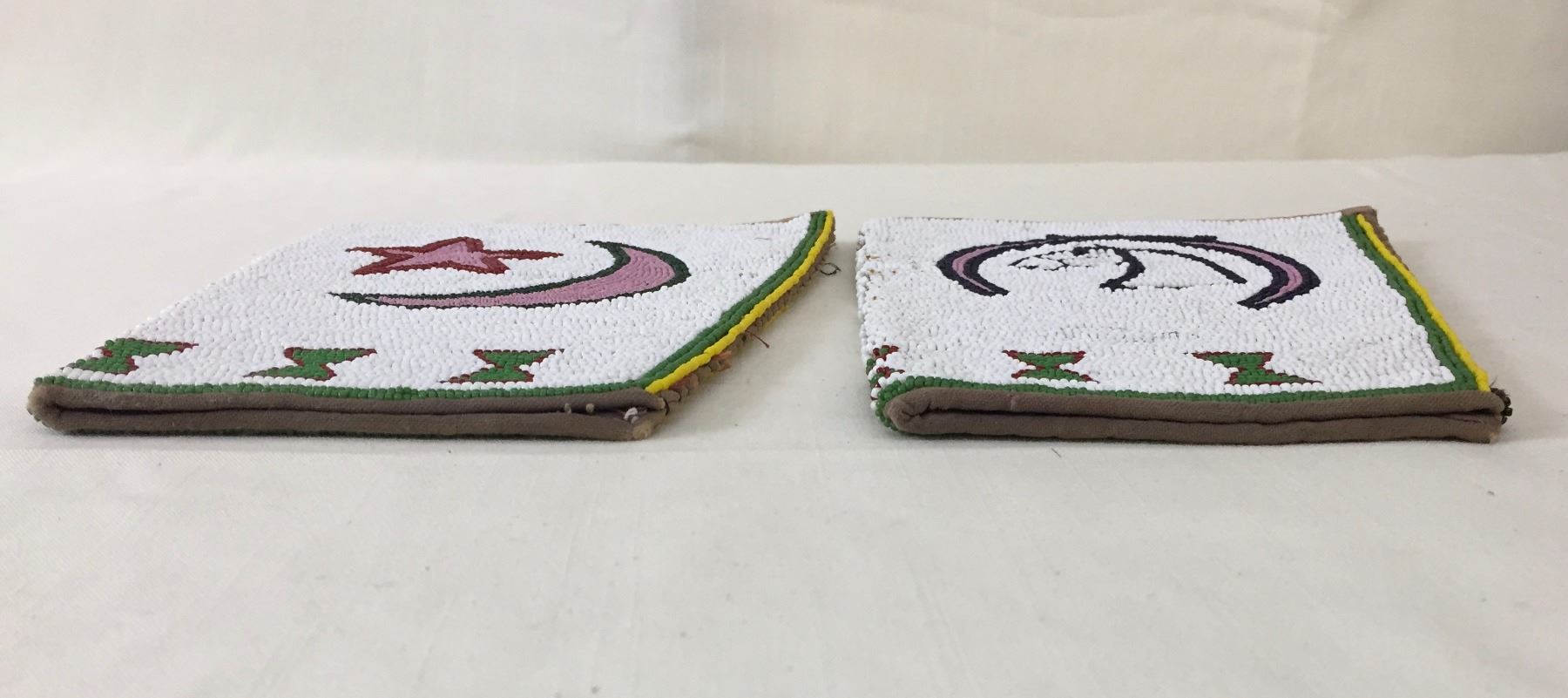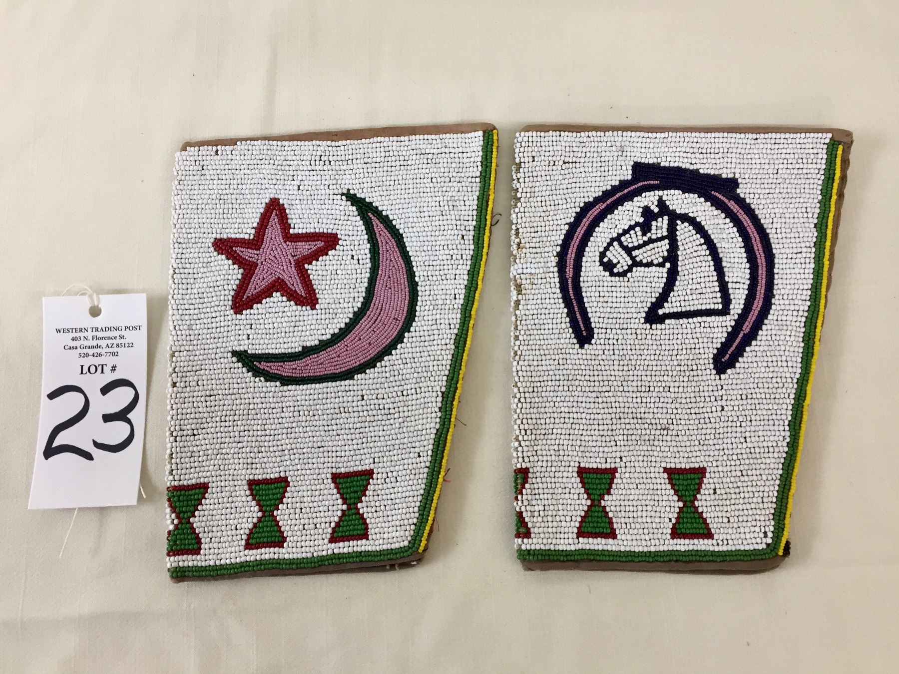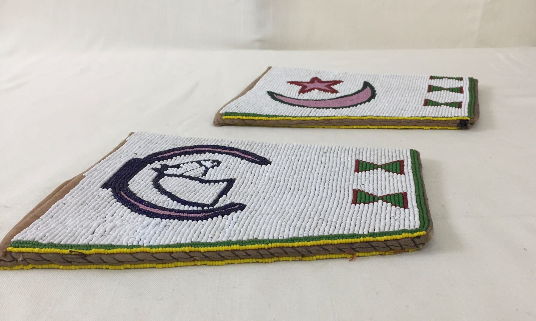 Description: For your pleasure we offer this beautiful set of beaded wrist cuffs featuring intricate beaded designs in the likeness of the moon and a star, and a horse with a horseshoe. Maker: Unknown Plains Native American bead artist. Approx. Age: Vintage.