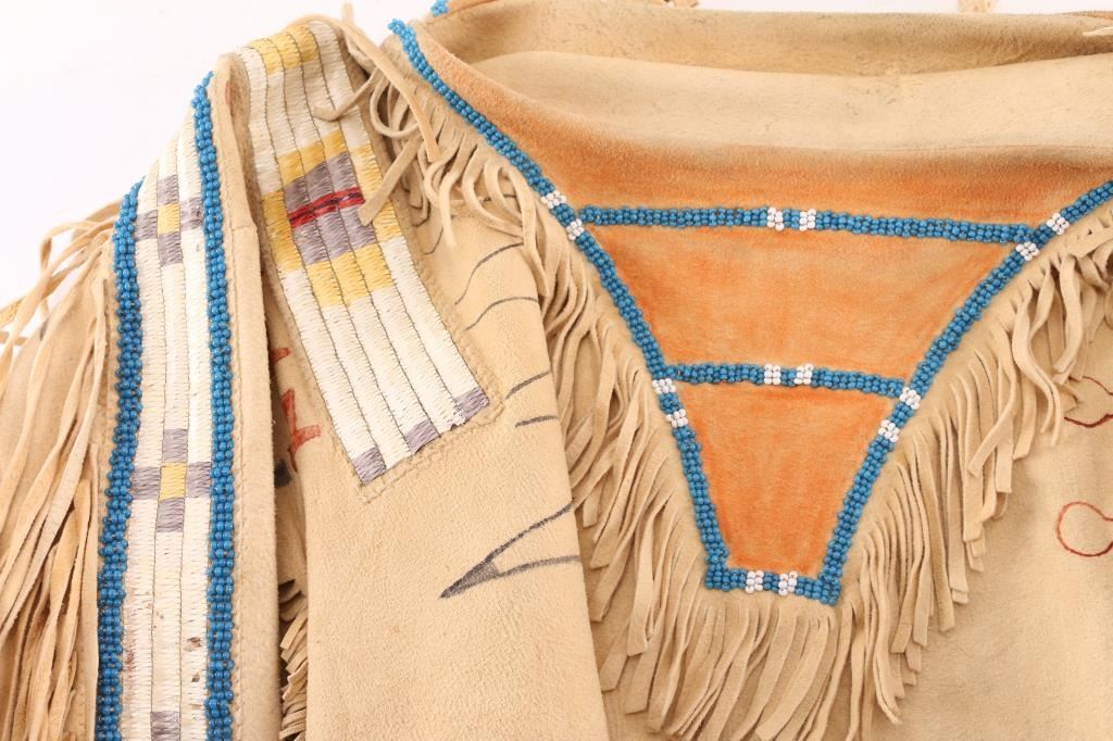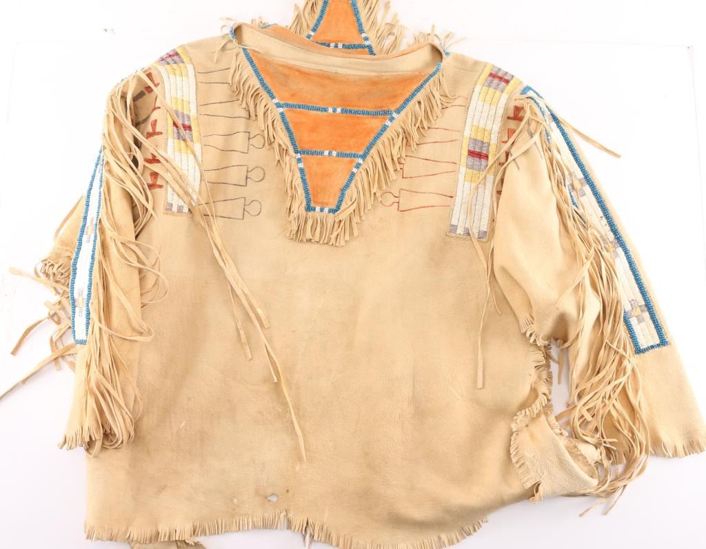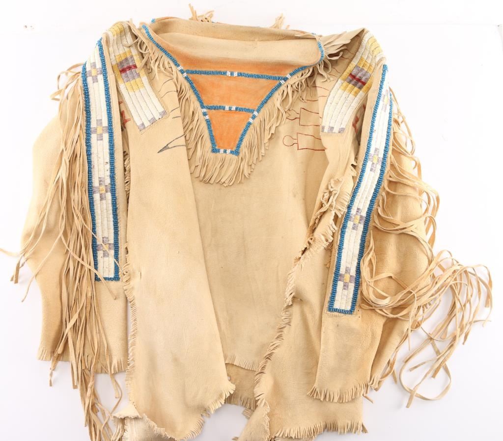 Plains Indian type elk hide war shirt. With shoulders and arms decorated with a quilled geometric pattern. Beaded and fringed collar Overall good condition.