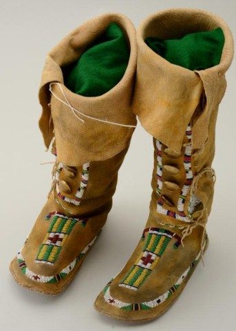 Beaded high top Plains Indian moccasins, sinew sewn, brass buttons, probably Sioux, man’s size, 10