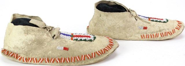 with tomato red, green faceted, white and orange beads, hard soles with repair to bottom right toe, 10" long.