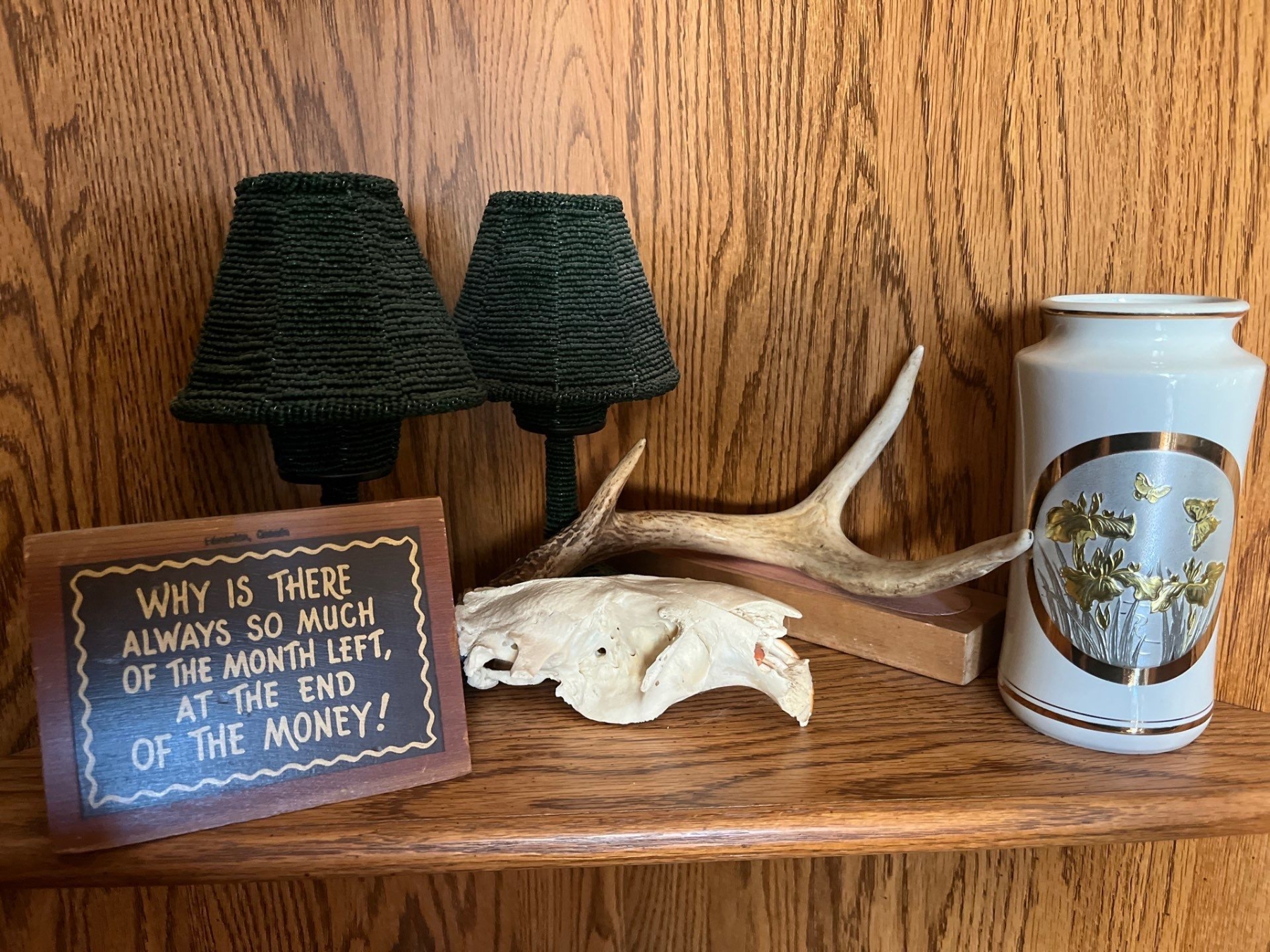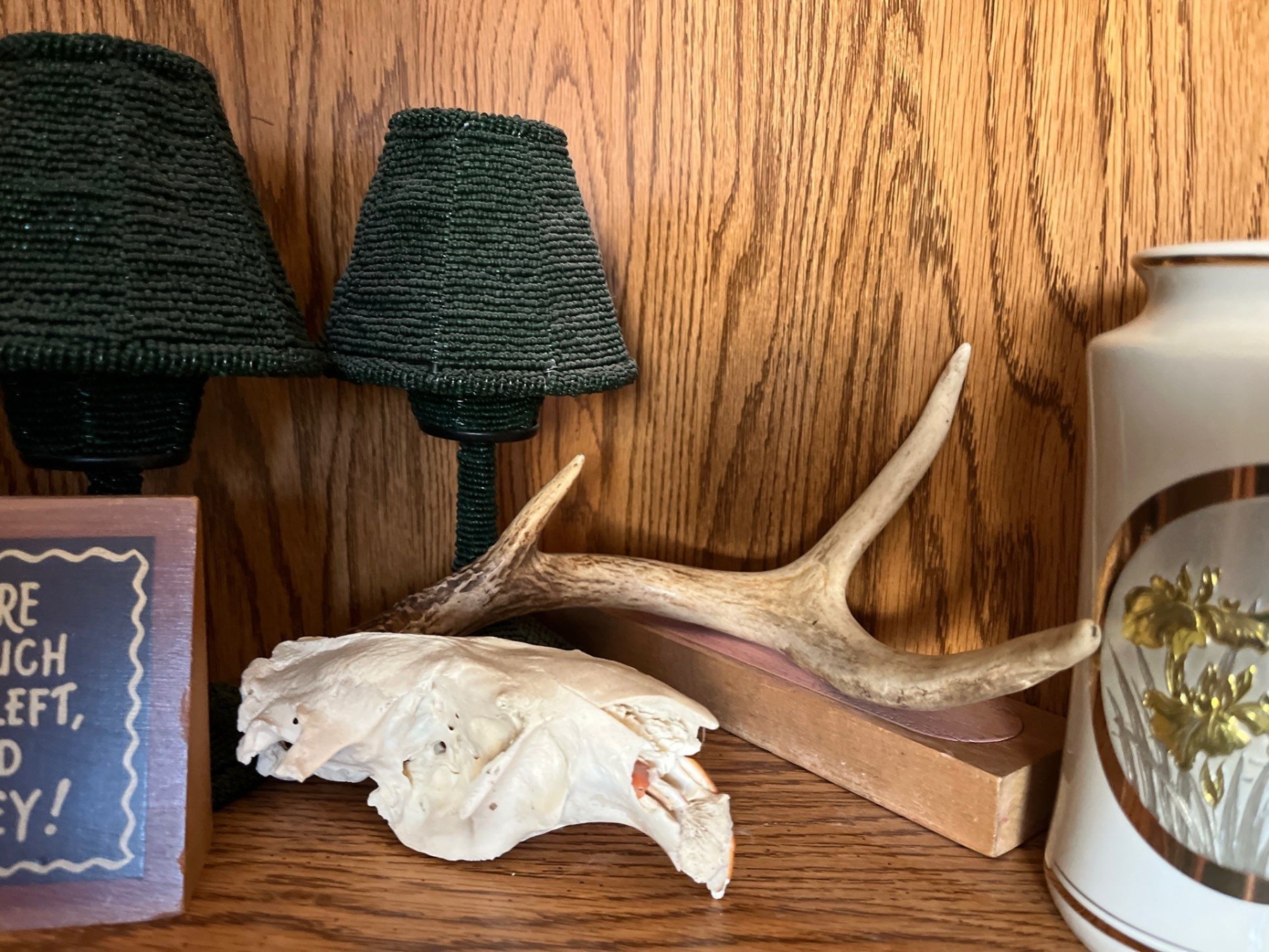 Beaded mini tea light holders, beaver skull, shed from a deer, vase made in Japan and cute little wooden sign