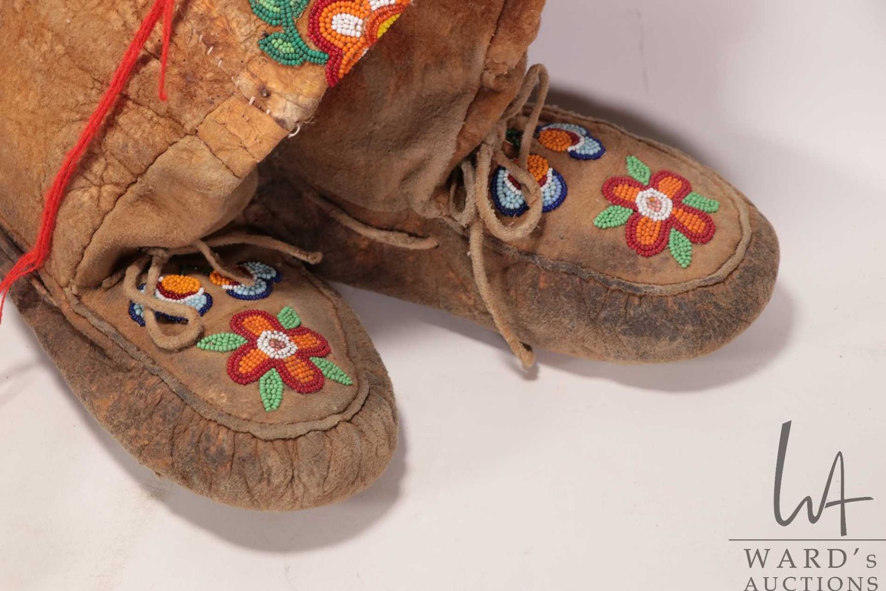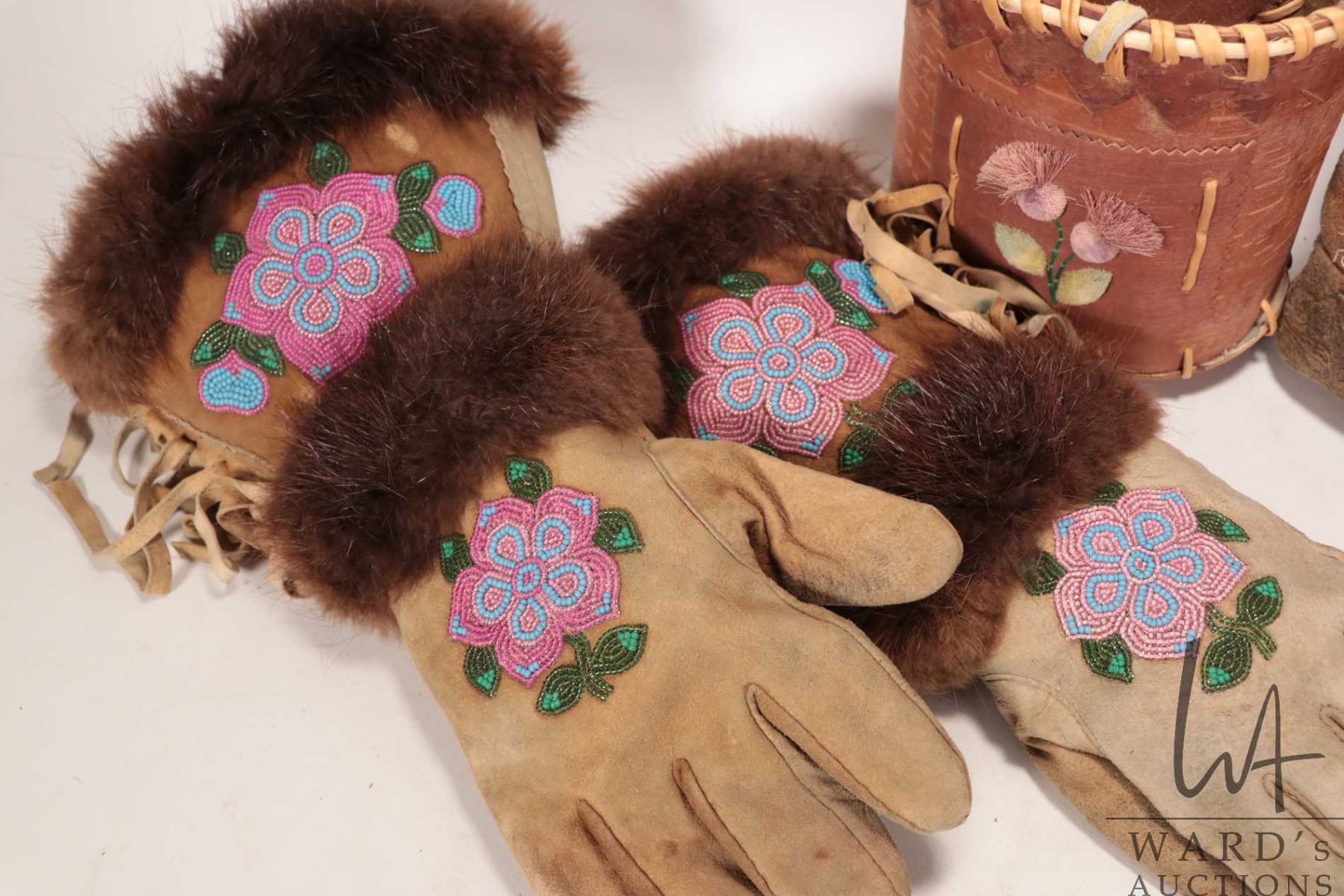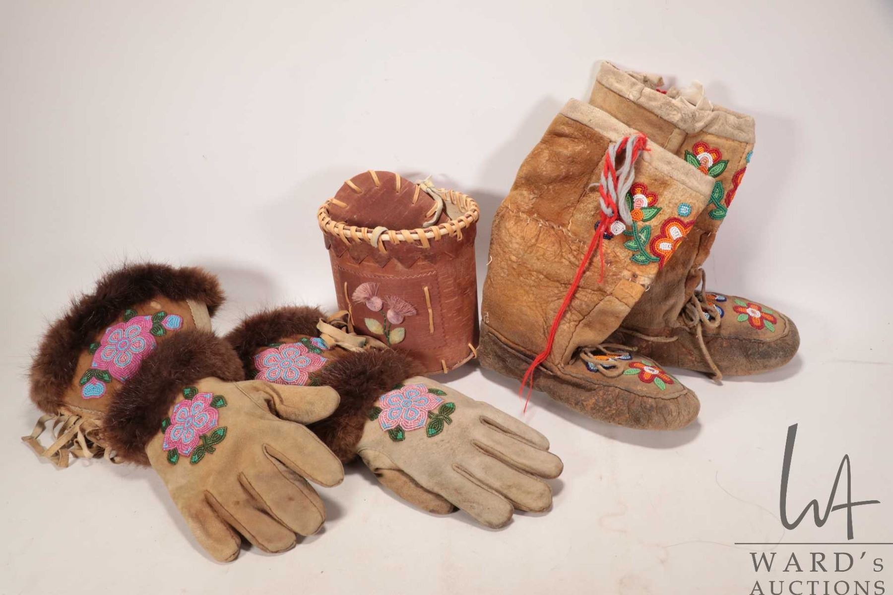 Beaded moccasins, beaded gaunlets with fur and a birch bark basket with tufting