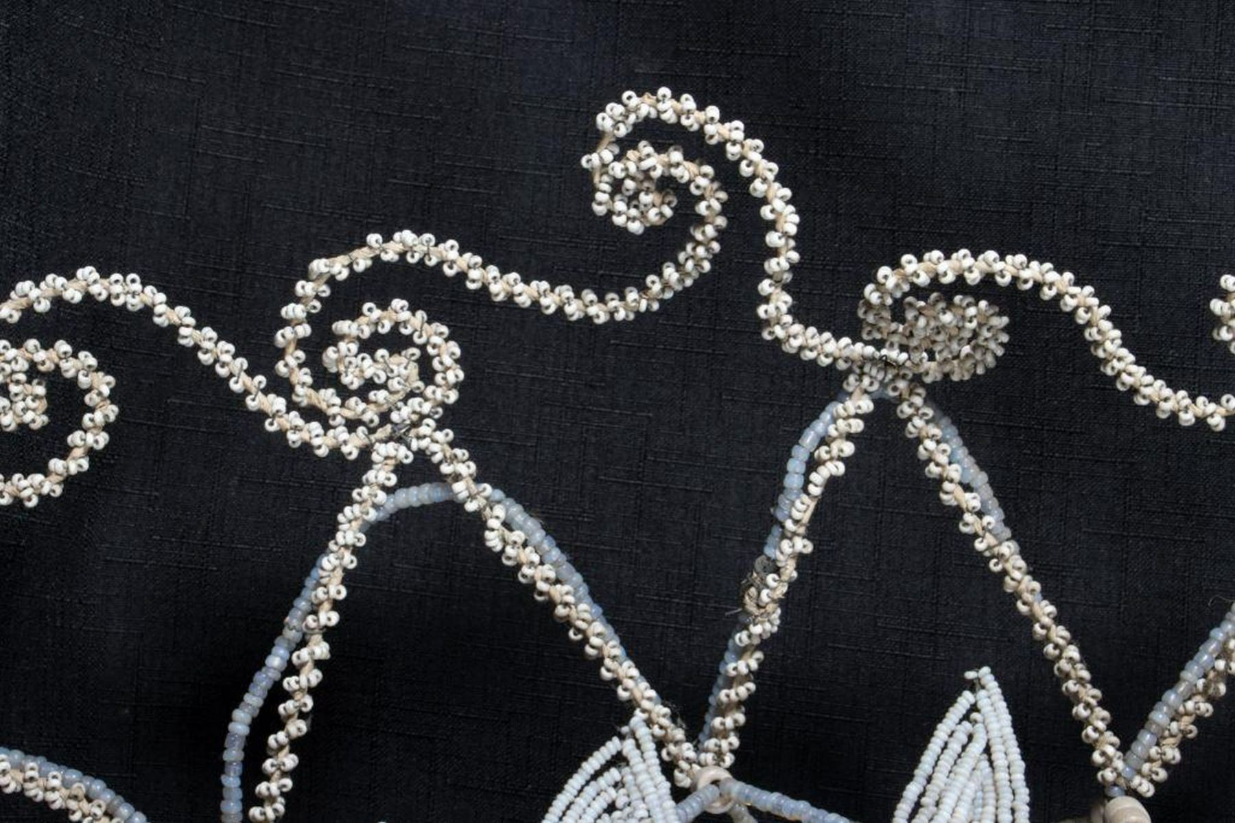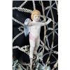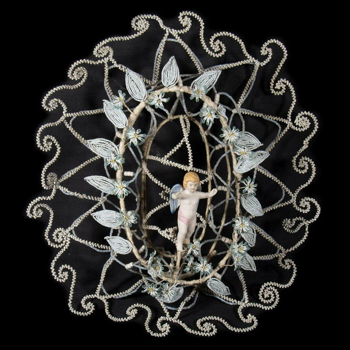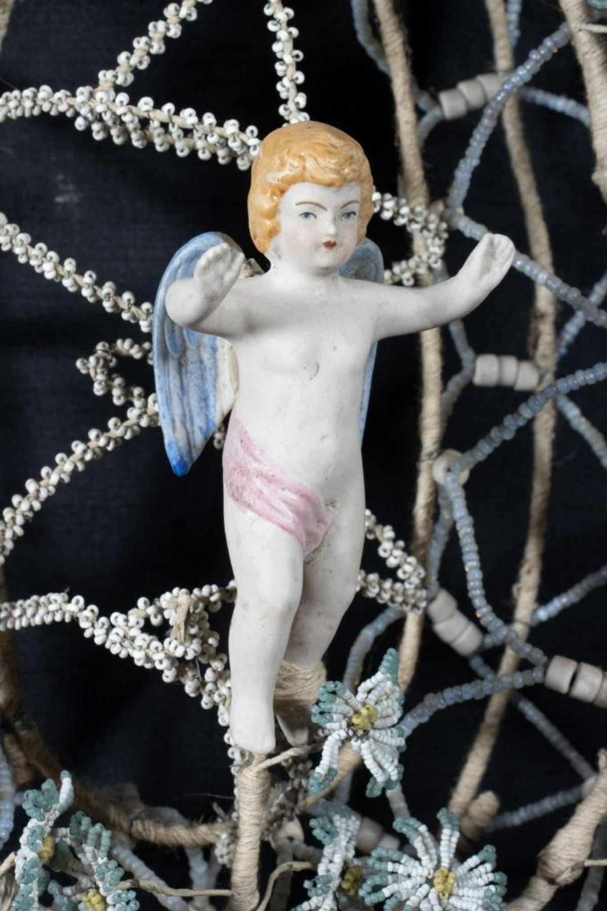 The frame formed of three string-wrapped wire circles, with surrounding scrolling beaded decoration, and a porcelain angel mounted at the center. 20in. x 17in.