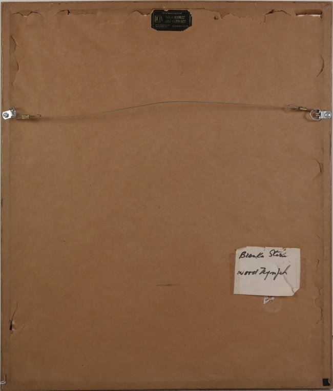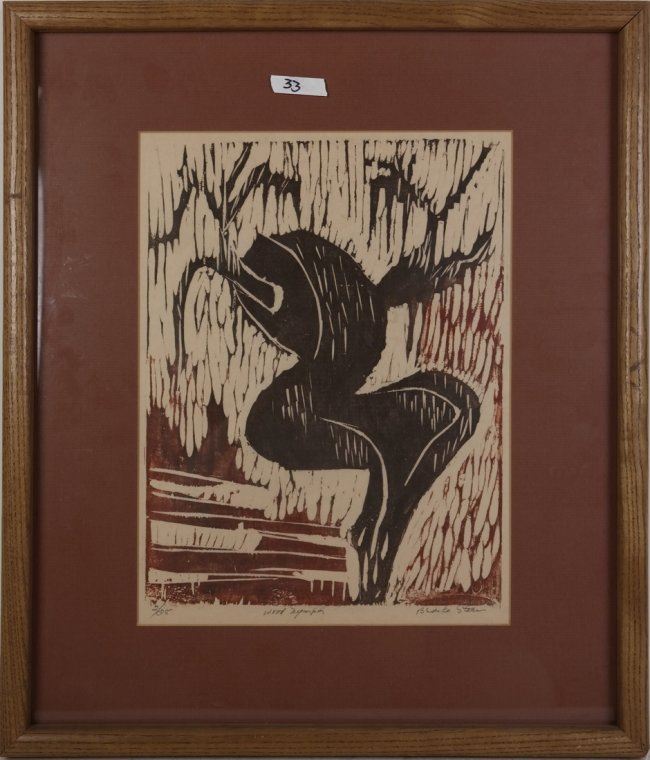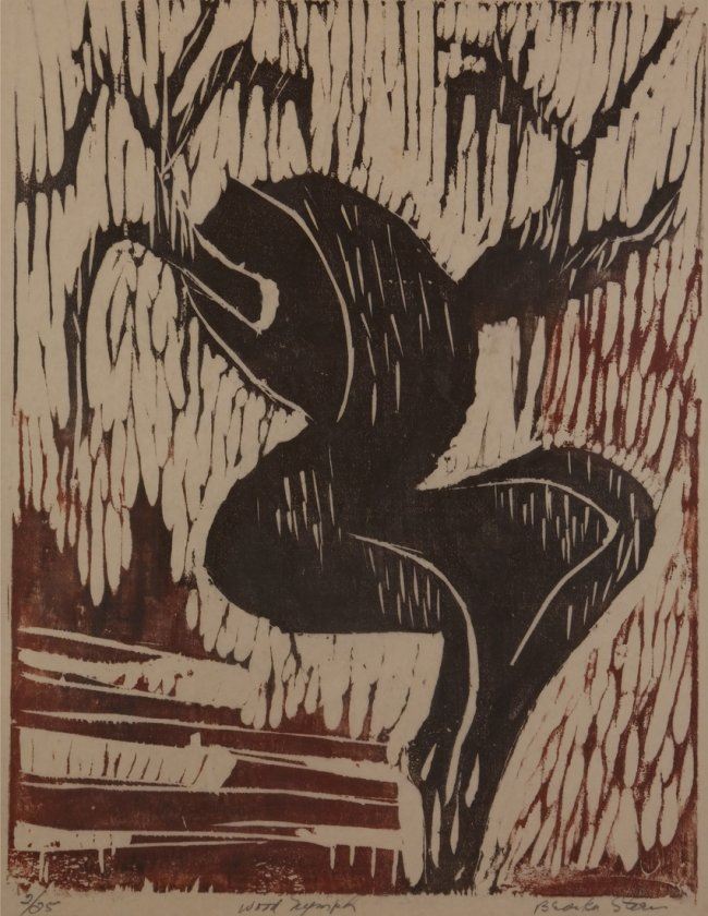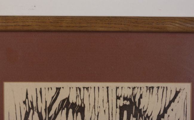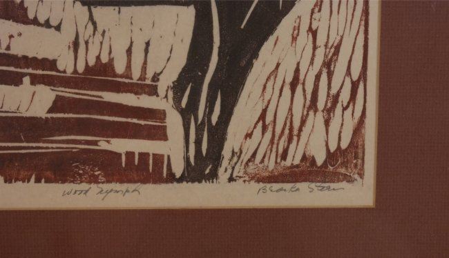 Woodcut titled "Wood Nymph" signed in pencil lower right, marked "2/25" lower left in pencil. [Sight: 13 1/4" H x 10" W; Frame: 20" H x 17" W]. Mat burn, not examined out of frame.