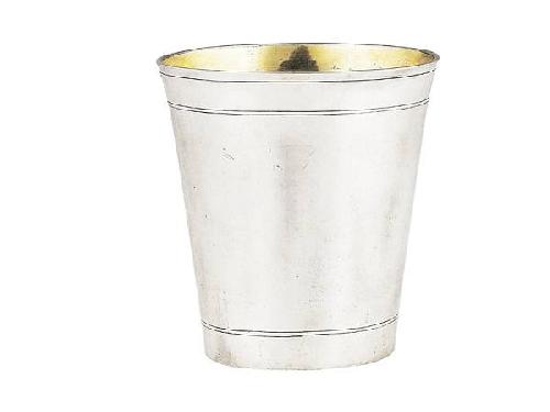 Silver, 231 g, with vermeil inside. Oval, tapering form, slightly everted rim. Plain surface with engraved rings. On the bottom there are the engraved initials of the owner: M K . Marked: Pest, between 1783 and 86, I year letter, Pasperger, József senior. Brestyánszky: 115, 196, 288. Size: 10.5 cm