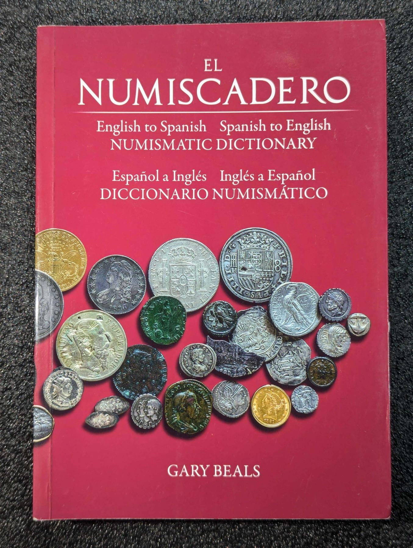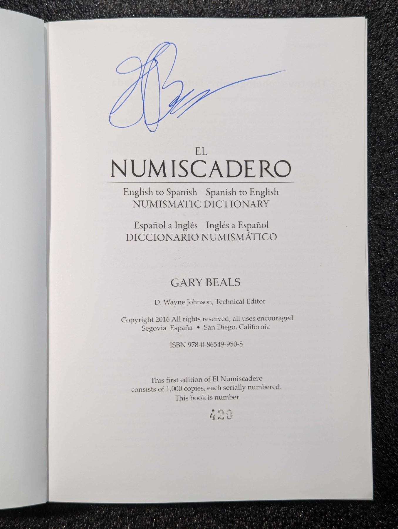 Beals, Gary. EL NUMISCADERO - ENGLISH TO SPANISH SPANISH TO ENGLISH NUMISMATIC DICTIONARY. Gary Beals, San Diego. 2016. 8vo. (4), 354, (2) pages. original oversized pictorial card covers. Signed by the author. Limited edition #420 of 1000 copies. Special Lists. Bibliography. B&w photos throughout. Spanish and English text. Fine. Learn what you need to know fast about Spanish and Spanish-American coins, banknotes and medals with this new numismatic dictionary. This book is the most extensive Spanish – English numismatic dictionary in the field. The dictionary's author is veteran numismatist Gary Beals, of San Diego, California who has lived in Spain for 16 years. - A first edition limited to 1,000 serially numbered copies — printed in Spain. - It is 258 pages long, a pound-and-a-half (870 grams) book, 17 cm x 24 cm (6 ¾ by 9 ½ inches) in size - Full color, plastic laminated cover with a sewn spine and fold-in wings. - It lists 2,543 Spanish terms and 1,876 English terms, some with many sub-categories. - It has 1,264 illustrations and photographs. - Terms cover those of the USA and the British Empire, Spain and the Spanish colonies. The book has four sections: An introduction, a Spanish to English glossary, a English to Spanish glossary, and a special lists section that includes major numismatic associations, grading coins, current spending power of old Spanish coins, money slang, monarchs of Spain, monarchs of Great Britain, Roman emperors, a list of popes, and Presidents of the USA. The listings at the rear of the book augment the main glossaries and clarify certain points quickly and easily. Lot weight: 1 lbs 15oz. Subject(s): Spanish, Spanish American Coinage.