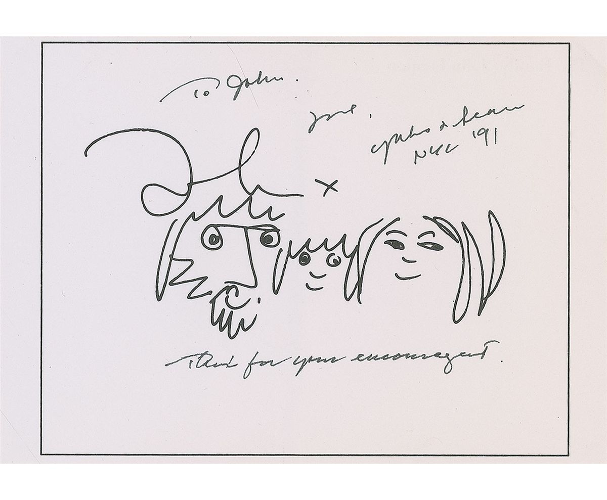 Postcard depicting Lennon’s line-drawing artwork of his family, 6 x 4.25, signed and inscribed in black felt tip, “To John, love, Yoko Ono Lennon, NYC ’91. Thanks for your encouragement.” In fine condition. Accompanied by a certificate of authenticity from Tracks.
