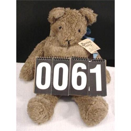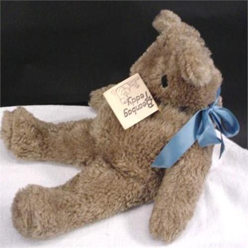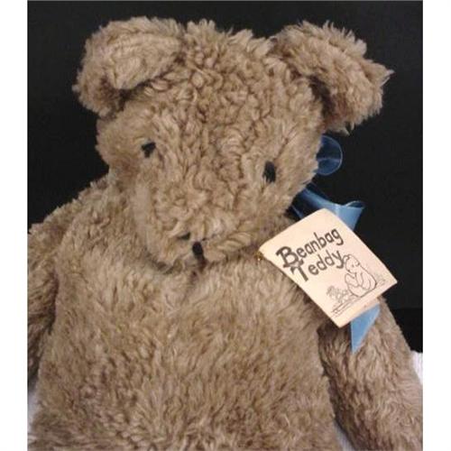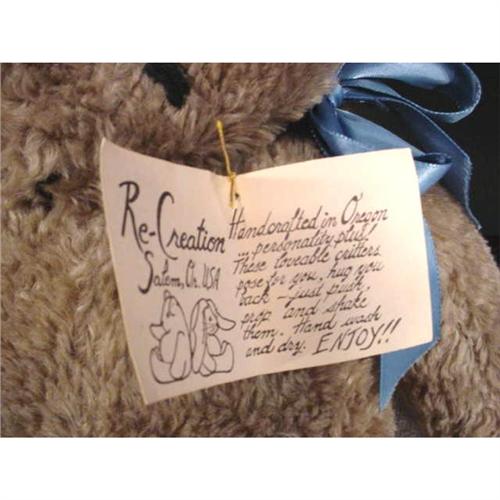 61-84 This bean bag teddy bear was hand-made in Salem, OR. The original tag reads, "Re-Creation... Handcrafted in Oregon...personality plus! These loveable critters pose for you, hug you back - just push, prop and shake them. Hand wash and dry. ENJOY!!" It orignally sold for $42.50. Measures 19" long, weighs 3lbs.