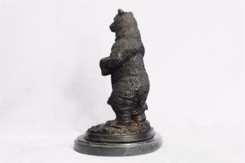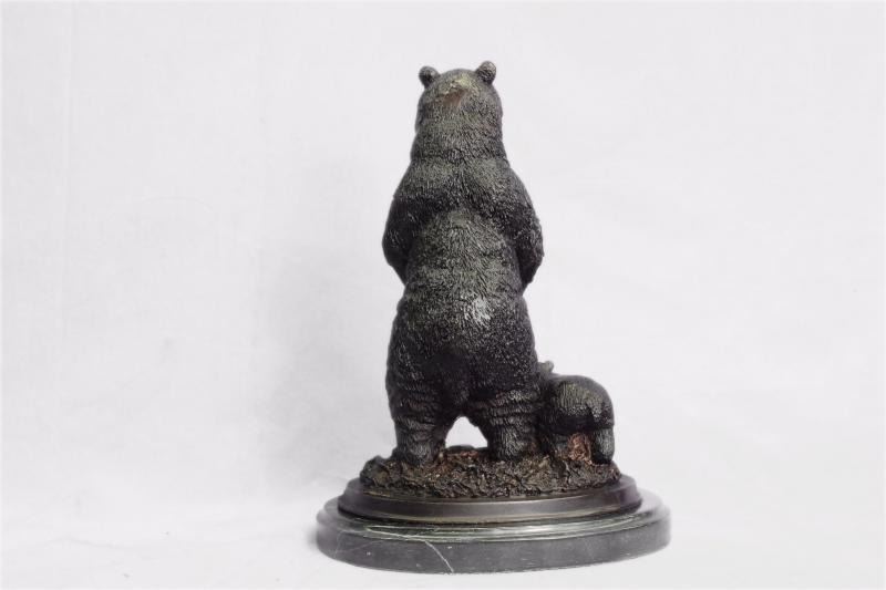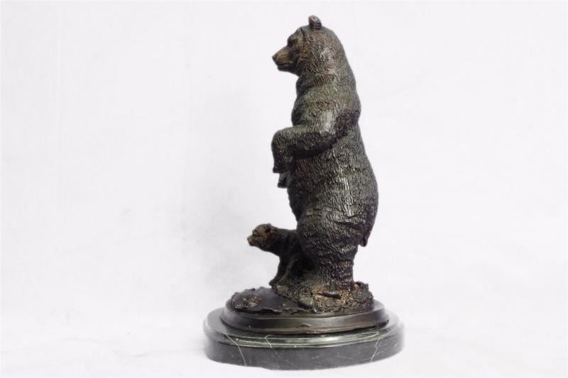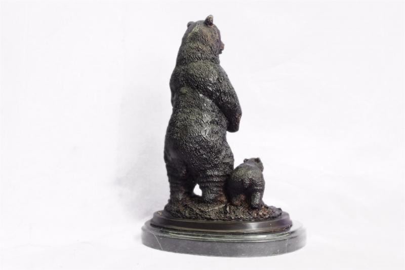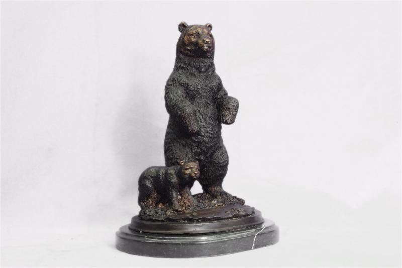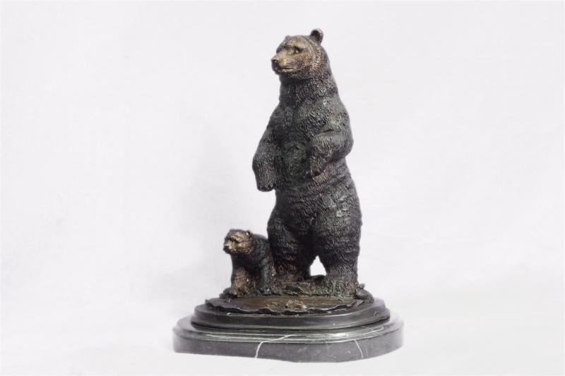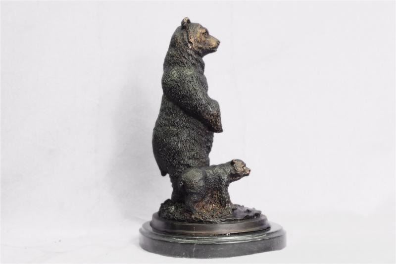 She stands tall on her hind legs and looks out over the river watching the salmon swim upstream. Her little cub leans against her leg making sure she is secure and safe being comforted by her touch. The cub stands on the edge of the river bank and dips her tiny paw into the water embracing this new experience. Her mother has taken her to the river bank to show her how to fish and to calm a rumbling tummy. This quality is seen in all the minuscule detail of the sculpture. The river bed and the debris of broken branches, rocks, pebbles, and leaf help create and capture the environment these wild bears roam in. The body proportion and fine-lined and texturized fur coats of the bears give them a life-like feel. They have absolutely gorgeous facial details as well as claws. This bronze sculpture captures a heartwarming moment of a mother bear teaching her cub. This bronze sculpture was cast using the Lost Wax Method and has a two-toned brown patina and is mounted on a marble base. Dimensions: Height 14 X Width 10 inches. Weight: 17 LBS.