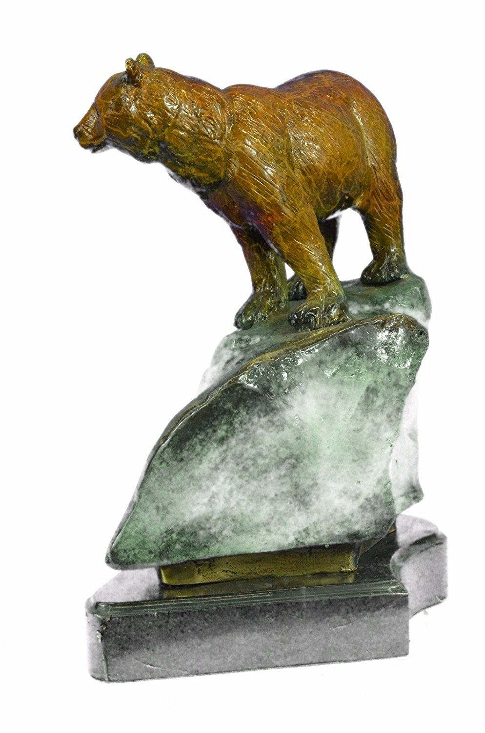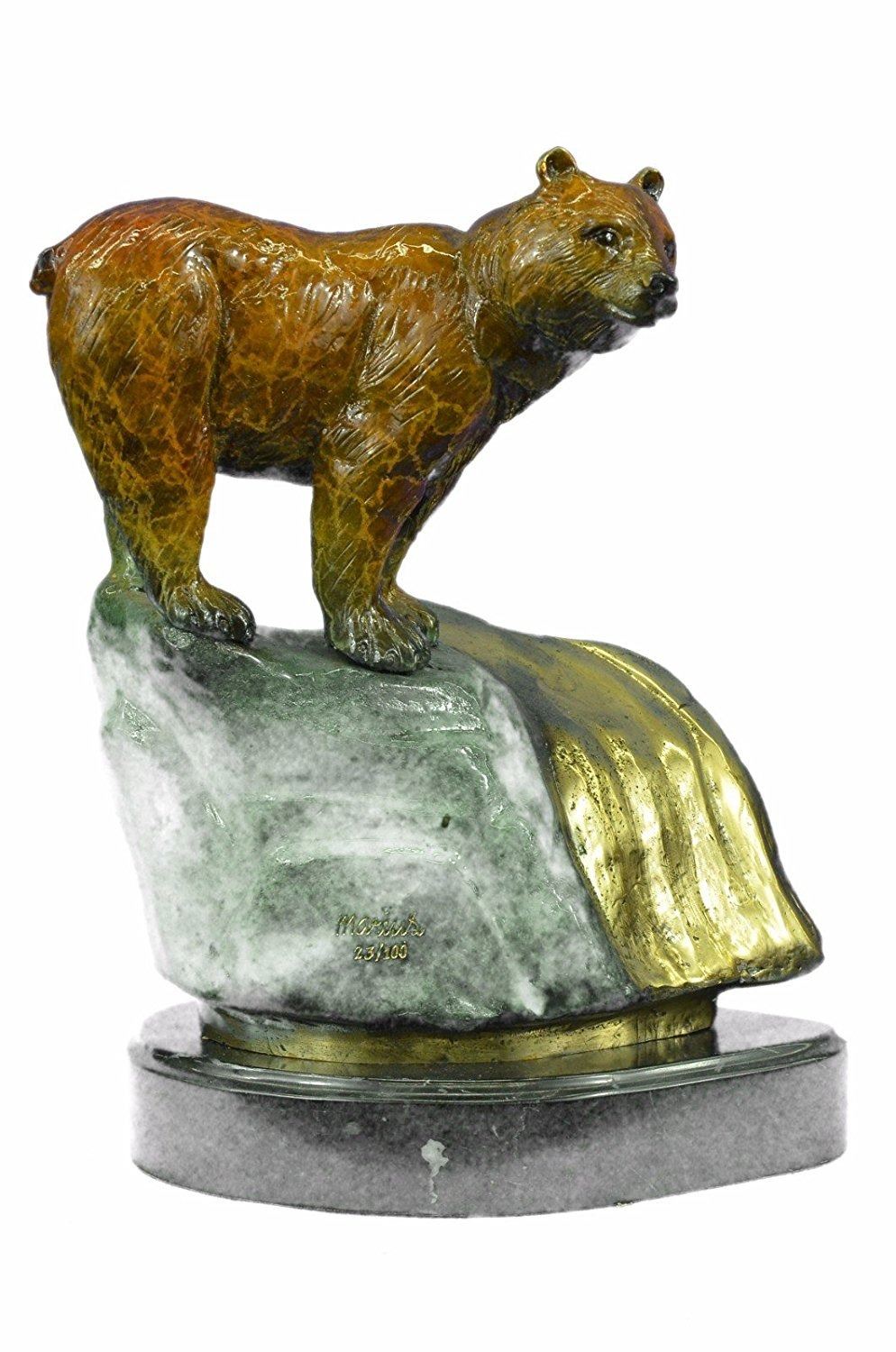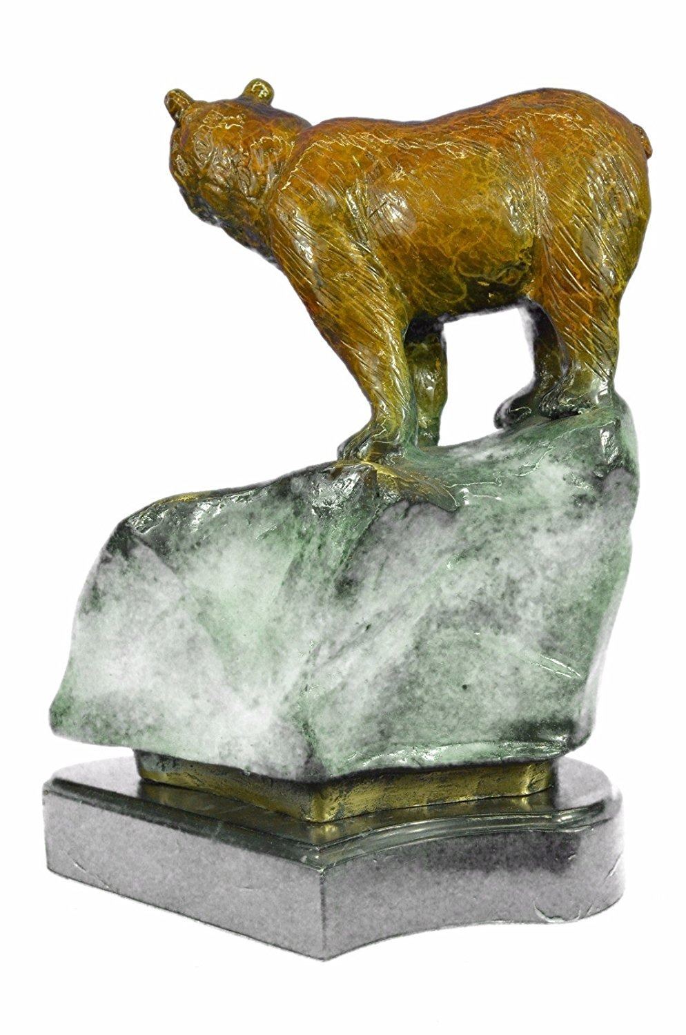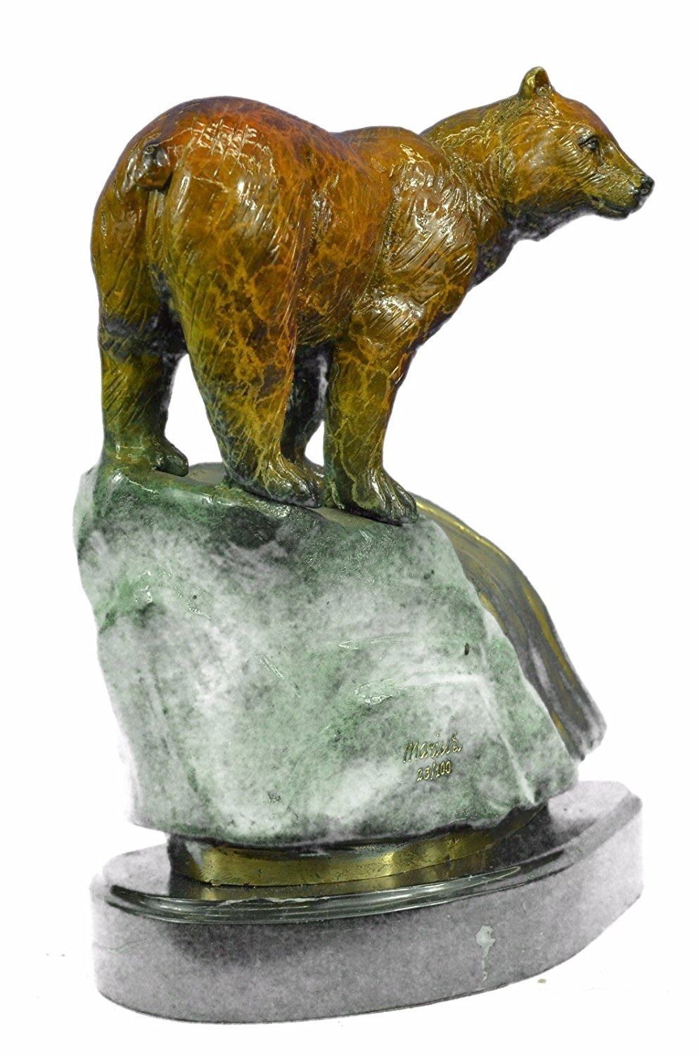 This sculpture is that of a Bear, one of which stands strong against the elements and high on safe ground. He looks out across the land, pondering his next path. Next to him runs a river that cascades downwards past him, most likely full of fish and a common place for Bears to feed themselves and their young. The ground he stands on is blue and likely frozen, and rests on a marble stand. He has a thick coat of a light brown Patina that is detailed to undoubtedly represent a thick coat of fur. This is a part of a collection with two other Bear pieces. This bronze sculpture was cast using the Lost Wax Method and has a special Patina. Bronze Dimensions with Marble Base: Height 12 X Width 10 inches. Weight: 13 LBS. Inventory: 59-94250NA7695