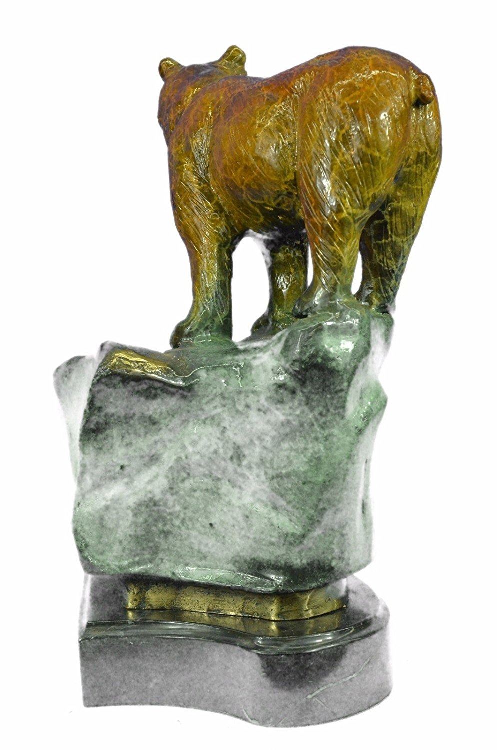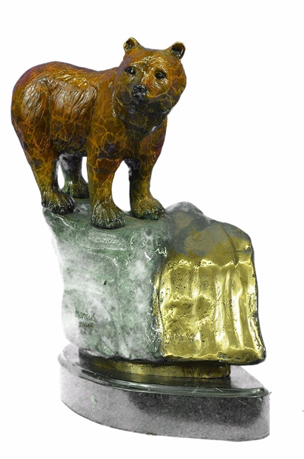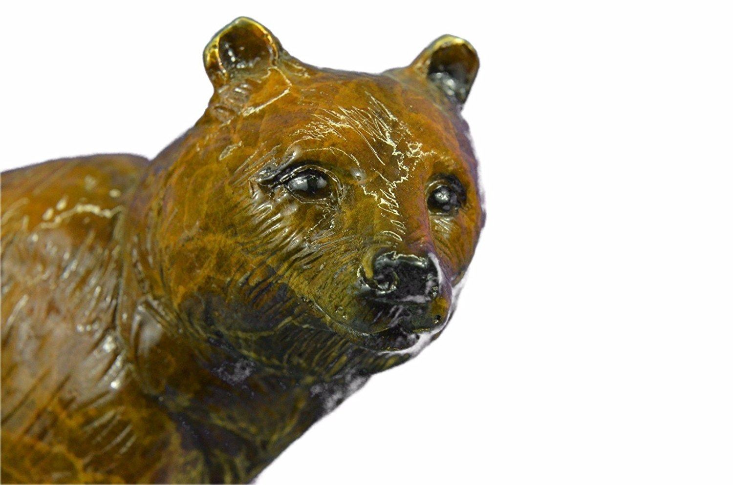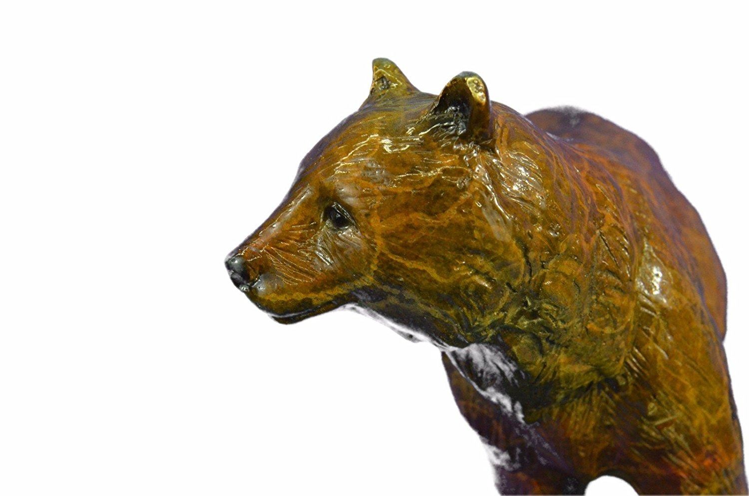 This sculpture is that of a Bear, one of which stands strong against the elements and high on safe ground. He looks out across the land, pondering his next path. Next to him runs a river that cascades downwards past him, most likely full of fish and a common place for Bears to feed themselves and their young. The ground he stands on is blue and likely frozen, and rests on a marble stand. He has a thick coat of a light brown Patina that is detailed to undoubtedly represent a thick coat of fur. This is a part of a collection with two other Bear pieces. This bronze sculpture was cast using the Lost Wax Method and has a special Patina. Bronze Dimensions with Marble Base: Height 12 X Width 10 inches. Weight: 13 LBS. Inventory: 59-94250NA7695