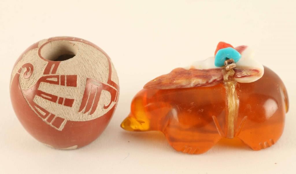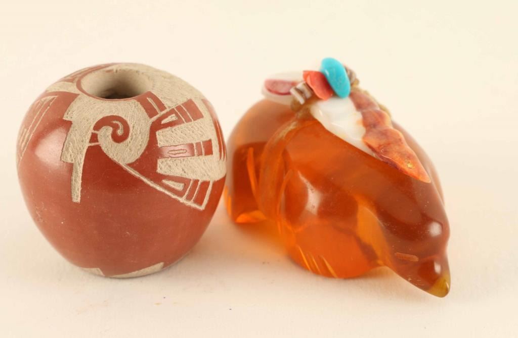 This Amber colored bear fetish and tiny pot would make perfect decorations of a window sill.