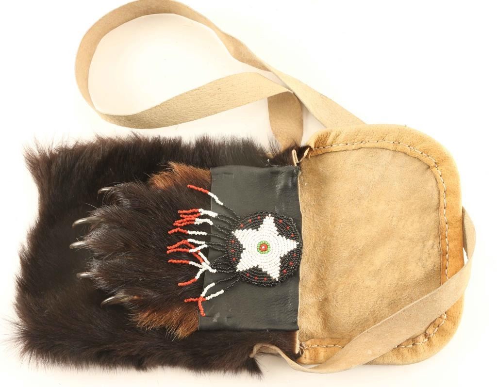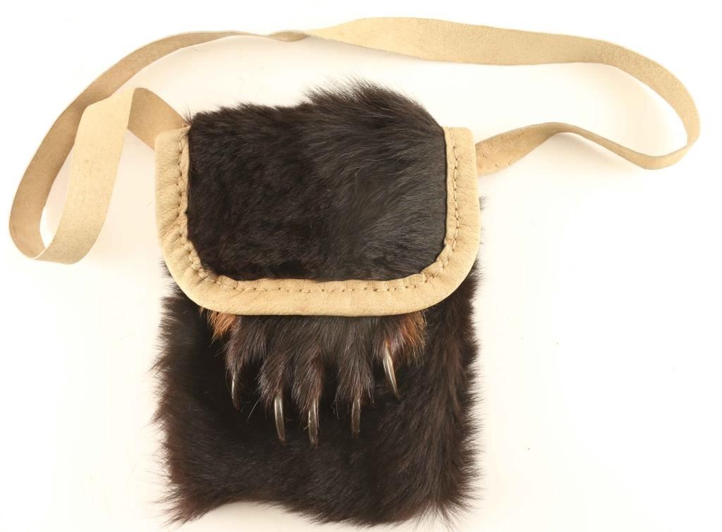 Leather purse with bear fur. Flap lifts up to reveal a bear paw with claws and a beaded star medallion with fringe and black leather backing. Measures 10"x8". Not to be sold in the state of California.