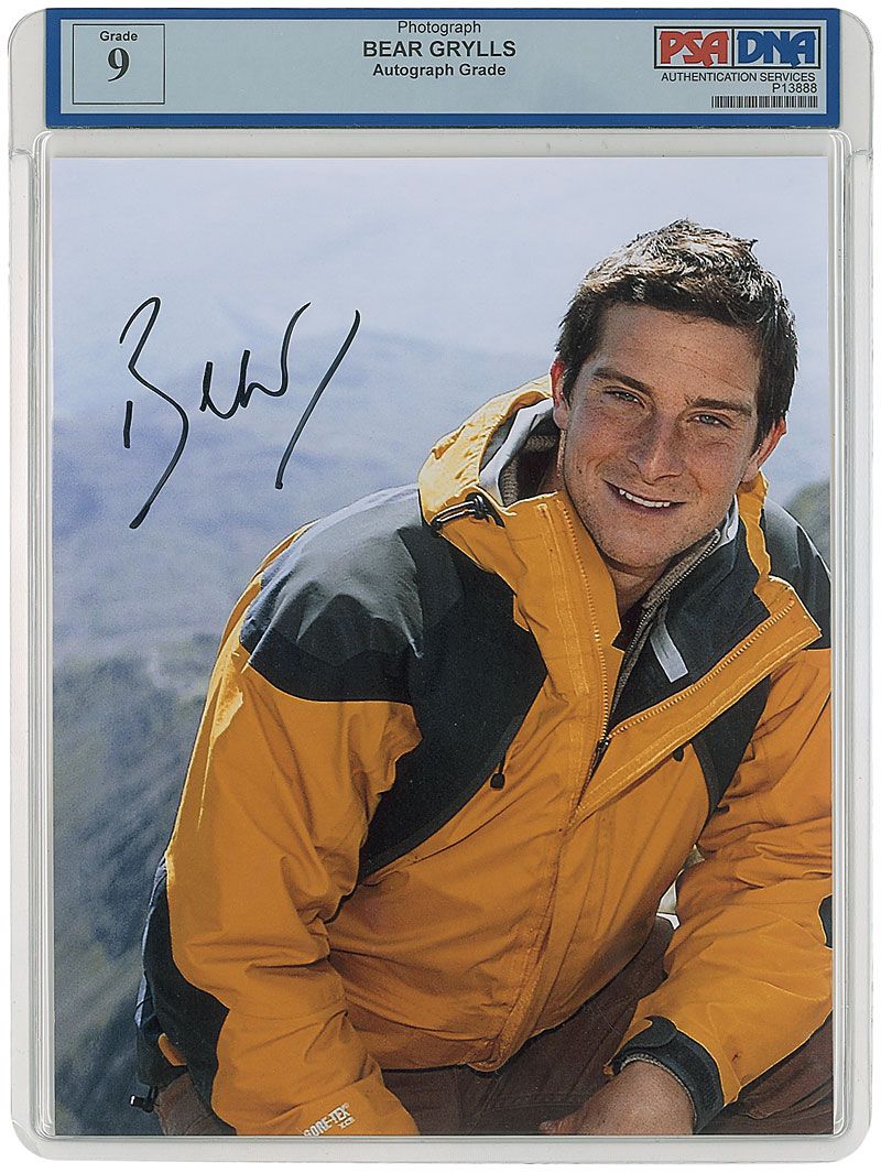 Color glossy 8 x 10 photo of Grylls posing outside, signed in black felt tip. Encapsulated in a plastic PSA/DNA authentication holder grading the autograph a “9.” In very fine condition. Accompanied by a full letter of authenticity and grading from PSA/DNA, again rating the autograph a “9.”