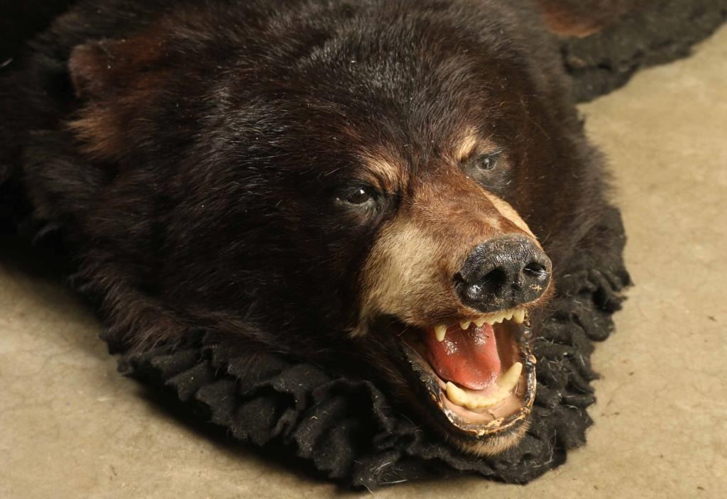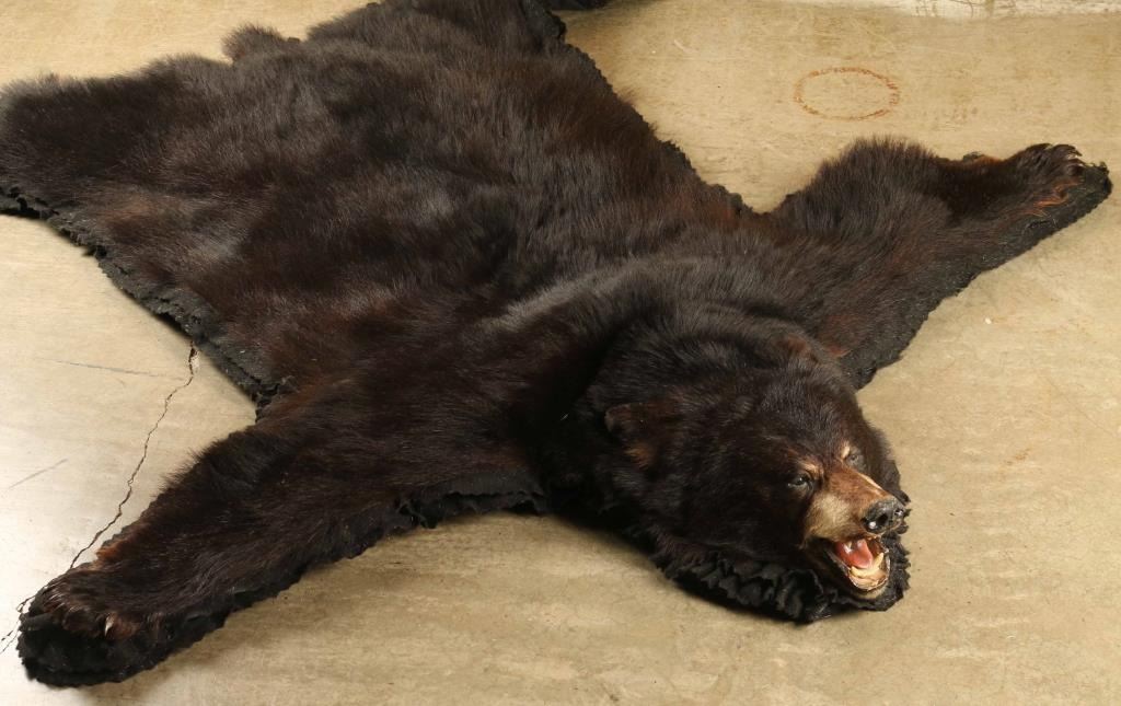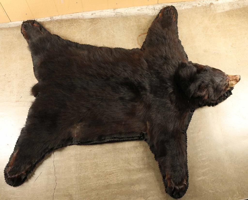 Black bear, has some bald spots mounted on black fabric. Measures approx. 67"l x 59"w.