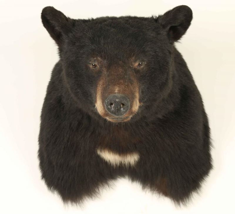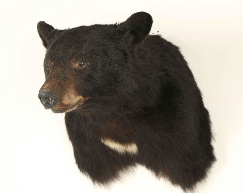 Black bear with small white patch below chin. Measures 18 1/2"l x 21"h x 25"w. Good condition. Perfect for cabin decor or man cave.