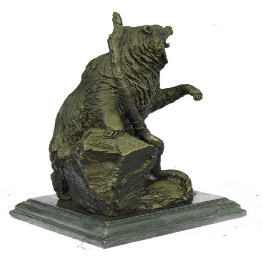 It features a bear standing on top of a cliff leaning its weight into a rock with a large branch in front of it. As the bear stands on its hind legs, it reaches the height of the nearby branch showing the grandeur of the bear, a fact which is further reinforced by the fact that the bear holds his mouth open in a large growl. To this day, bears play a prominent role in the arts, mythology, and other cultural aspects of various human societies. The bear was thought to possess diplomacy equal to its great strength and it is the emblem of ferocity in the protection of kindred. A bear is also a symbol of healing and personal health, strength and bravery. Bronze Dimensions with Marble Base: Height 10 X Width 6 inches. Weight: 10 LBS.