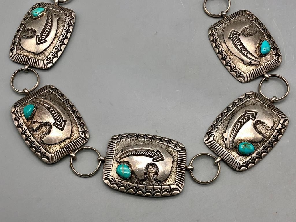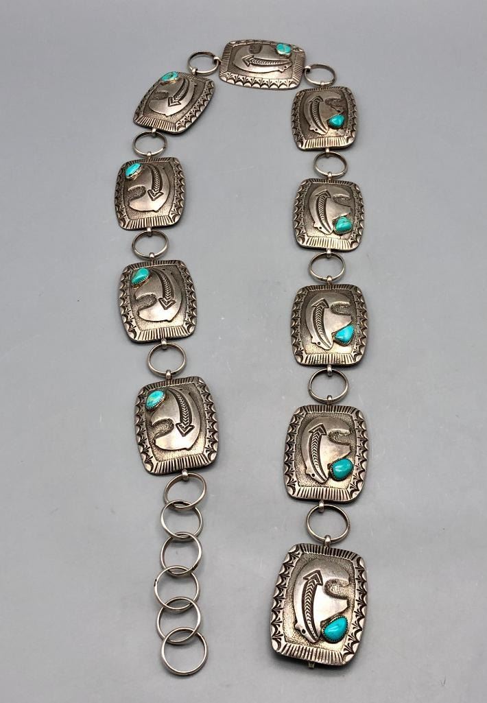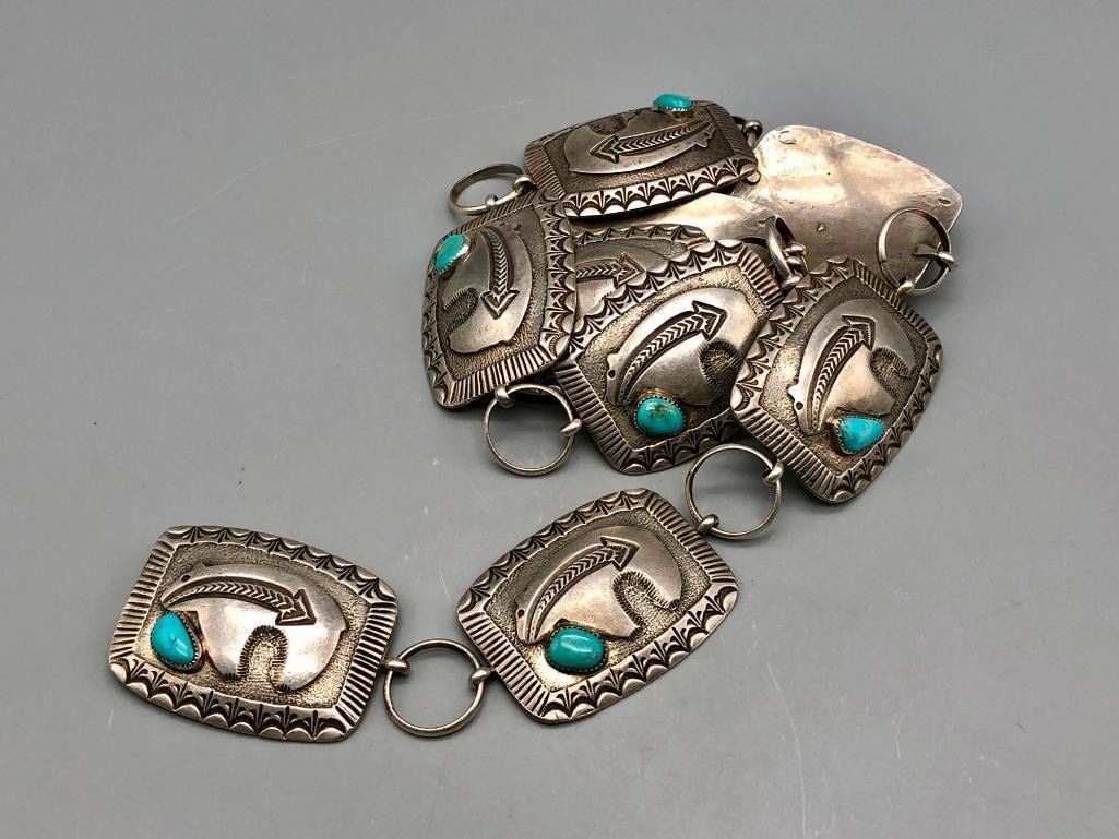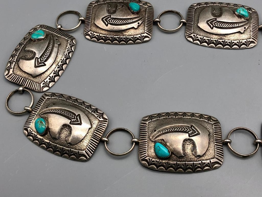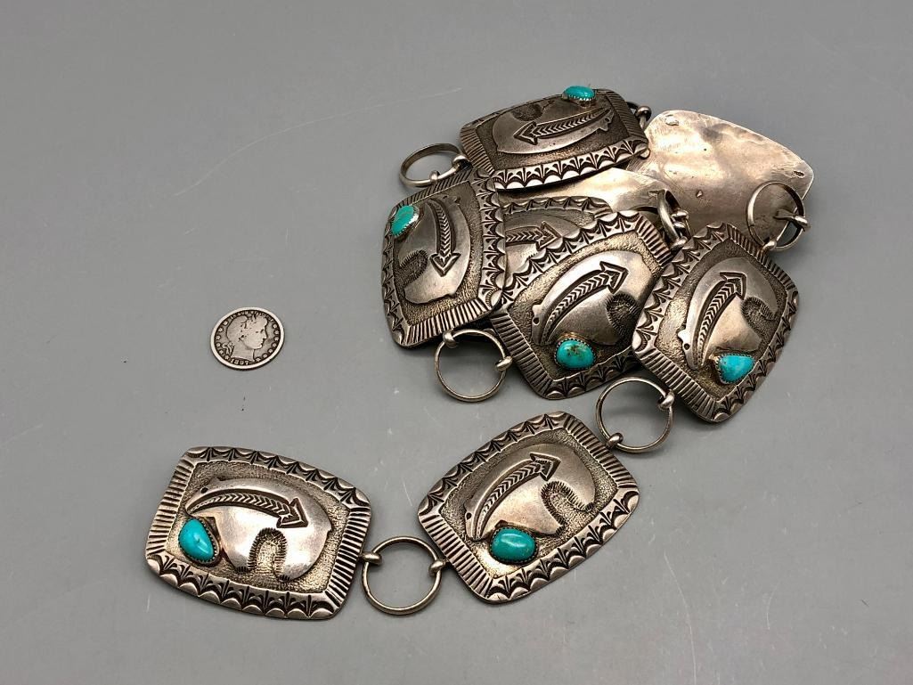 For sale in this lot is a bear themed sterling silver and turquoise concho belt. This is a beautiful link style concho belt with bear overlay designs. Each concho is set with a beautiful turquoise cabochon. This is a fabulous concho belt that would go with numerous outfits and looks! MAKER: Unmarked. APPROX AGE: Circa 1970s. SIZE: Overall length is 34-3/4 inches long X 1-7/8 inches wide. Weighs 472.9 grams. CONDITION: Good for its age, normal wear expected. Please look closely at the pictures as they are an important part of our description and are hereby incorporated into the description, specifically with regards to condition. SHIPPING: There will be a $5 handling / packaging fee for shipping this lot. The actual cost of postage will be added on top of that. BUY IT NOW: If you would like to buy this item now, without waiting for the auction day to bid on it, we do offer this option (which is available up to 48 hours before the actual auction starts). The “Buy it Now” price is the high estimate of this lot (plus applicable fees and the Buyer's premium is discounted to 10% when using the Buy it Now option). If you would like to exercise this option, you must contact us by email (or phone as long as you talk to someone live). Reference this lot number and your intention to "Buy it Now."