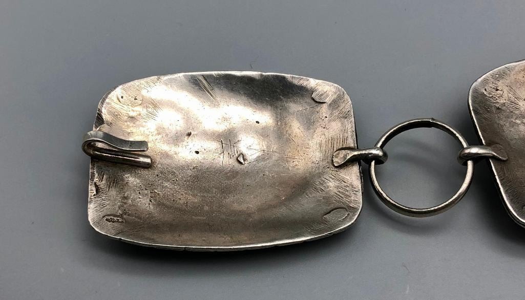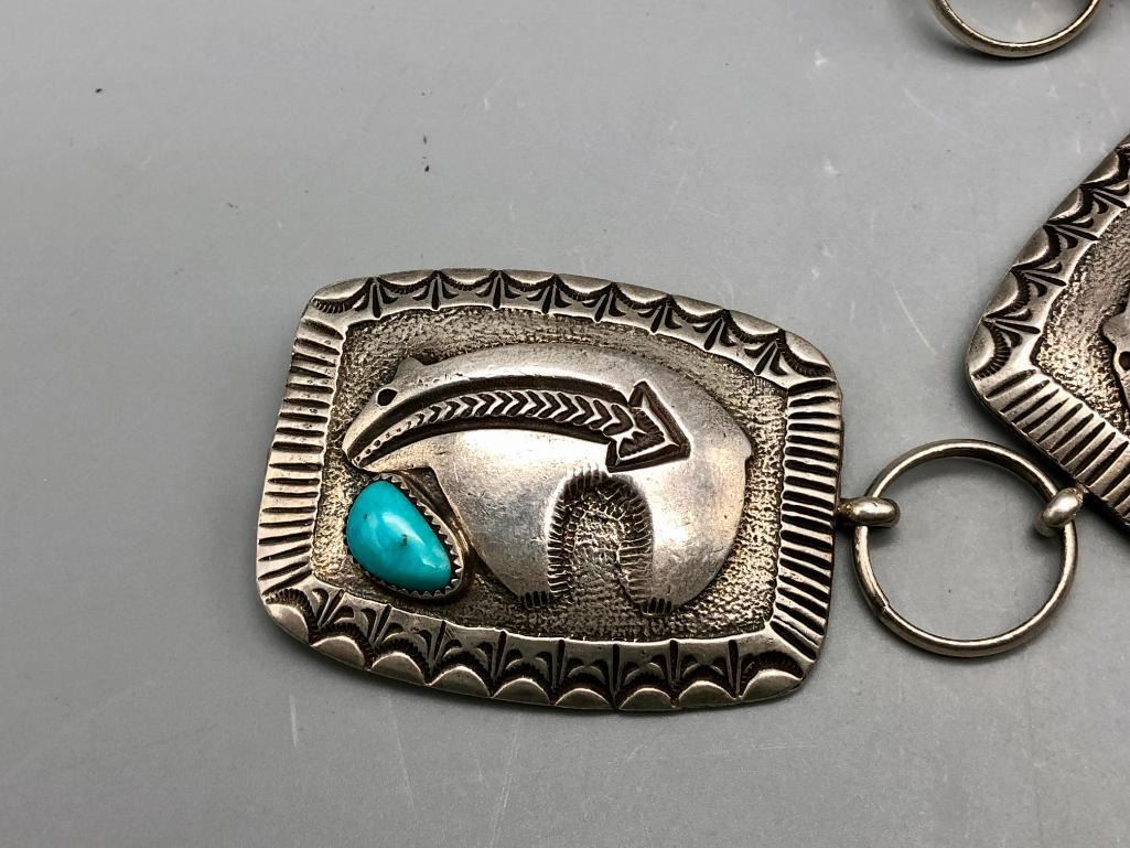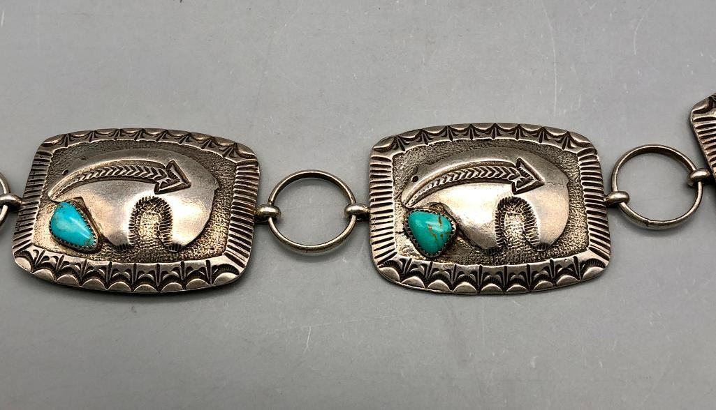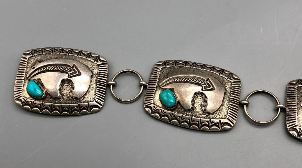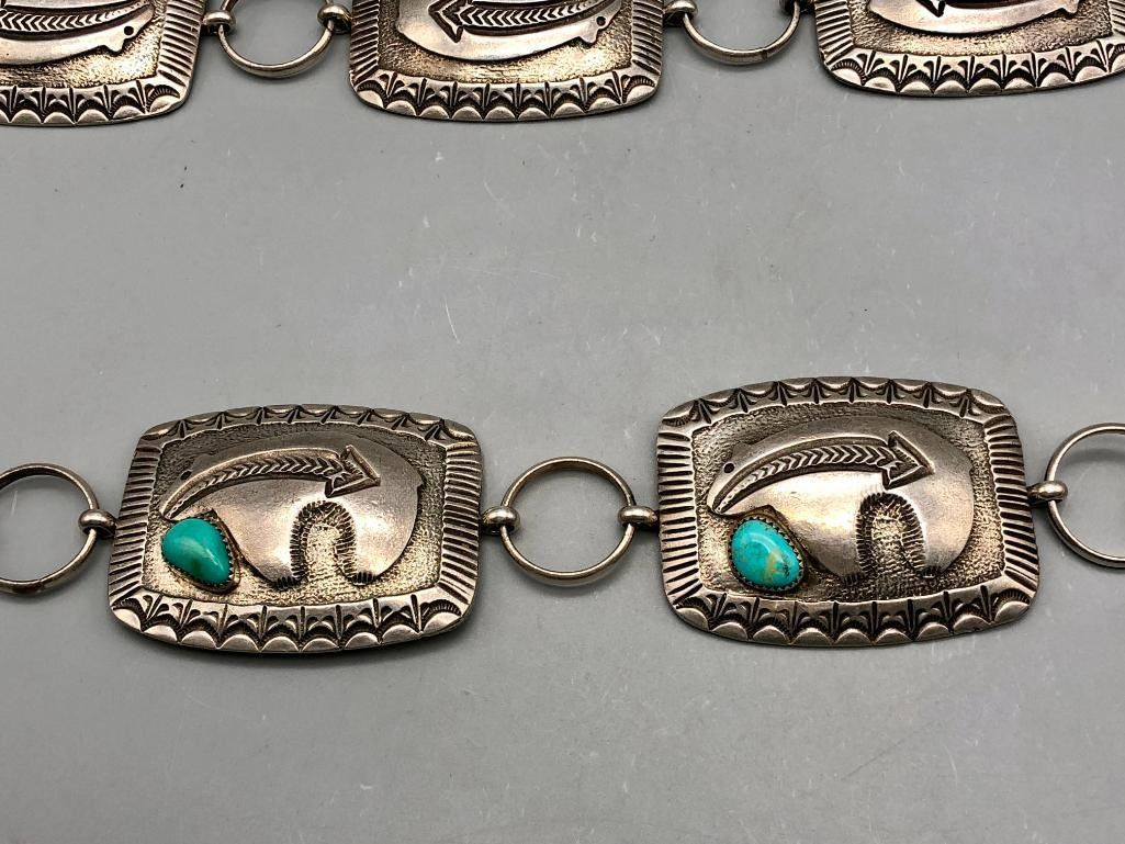 For sale in this lot is a bear themed sterling silver and turquoise concho belt. This is a beautiful link style concho belt with bear overlay designs. Each concho is set with a beautiful turquoise cabochon. This is a fabulous concho belt that would go with numerous outfits and looks! MAKER: Unmarked. APPROX AGE: Circa 1970s. SIZE: Overall length is 34-3/4 inches long X 1-7/8 inches wide. Weighs 472.9 grams. CONDITION: Good for its age, normal wear expected. Please look closely at the pictures as they are an important part of our description and are hereby incorporated into the description, specifically with regards to condition. SHIPPING: There will be a $5 handling / packaging fee for shipping this lot. The actual cost of postage will be added on top of that. BUY IT NOW: If you would like to buy this item now, without waiting for the auction day to bid on it, we do offer this option (which is available up to 48 hours before the actual auction starts). The “Buy it Now” price is the high estimate of this lot (plus applicable fees and the Buyer's premium is discounted to 10% when using the Buy it Now option). If you would like to exercise this option, you must contact us by email (or phone as long as you talk to someone live). Reference this lot number and your intention to "Buy it Now."