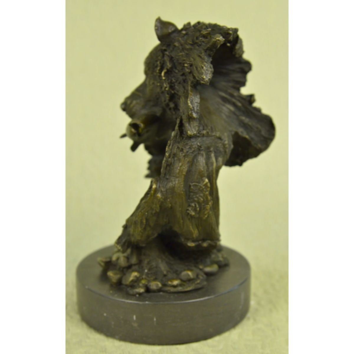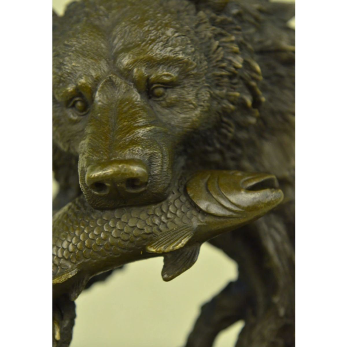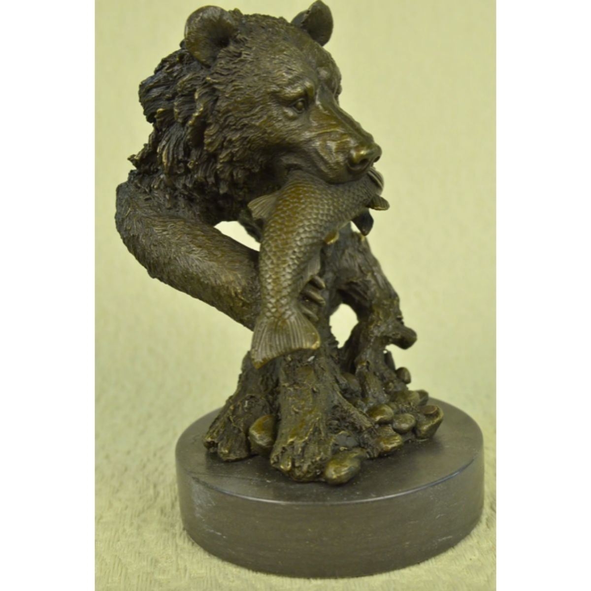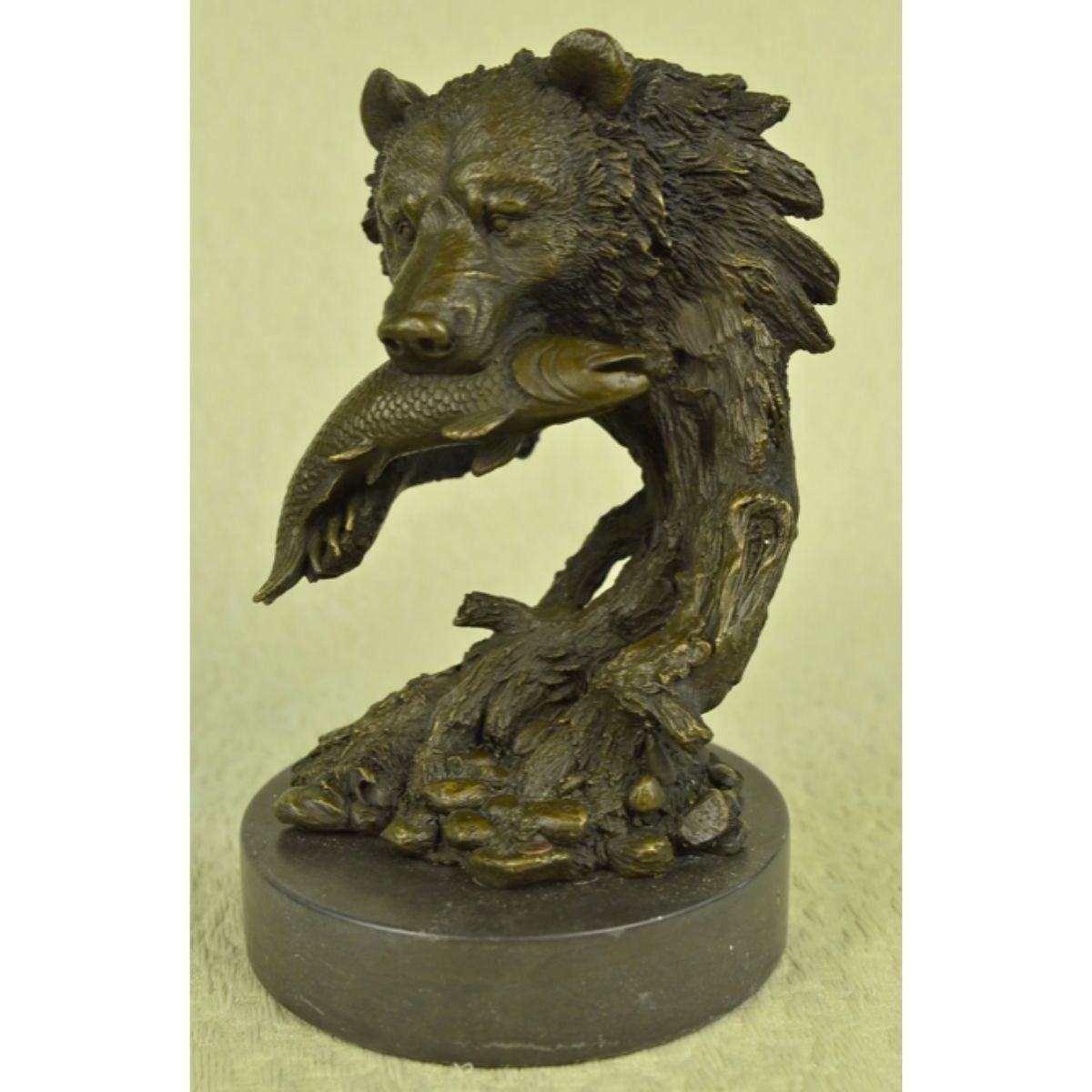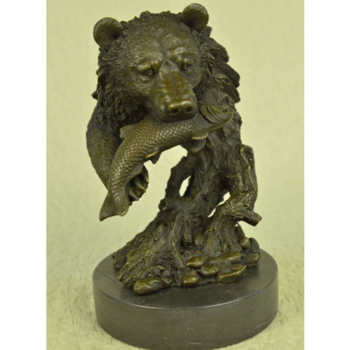 Bear With Fish Catch, lodge, fish camp sculpture. Lost wax casting method bronze, with brown patina, mounted on marble base. 11" H X 8" W. 15lbs.Â
