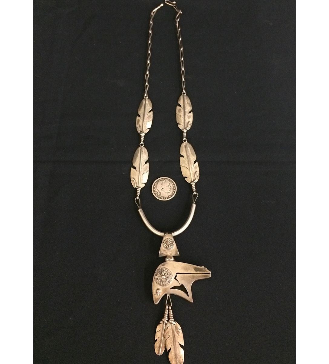 This Vintage Sterling Bear and Feather necklace is signed Ben Begay. It fits approx. 22" around the neck and weighs approx. 67.7g.