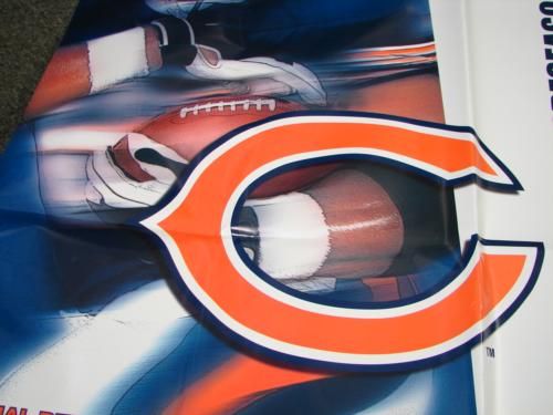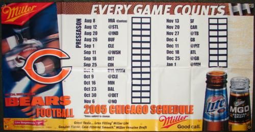 This Chicago Bears 2005 schedule appears on a Miller Beer sponsored 34" x 72" vinyl banner. It features exciting graphics, and the motto "Every Game Counts." It has some normal wrinkles, but is otherwise in excellent condition. The grommet holes make it ready for hanging. The 2005 season was what lead up to the current Bears winning season!