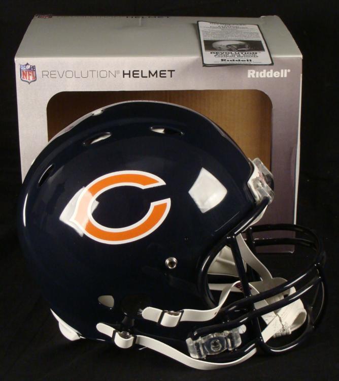 This Revolution model football helmet by Riddell is the official helmet of the NFL. It is in mint condition in the original box, which contains a numbered hologram sticker. The size is Large. This helmet is clean and ready for autographs. Take it to a signing, and you'll increase its value greatly. * This is the real deal, and any Bears fan will love having this piece of official equipment.