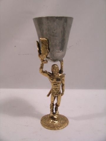 The fantasy-adventure 'The Beastmaster', starring Marc Singer and Rip Torn, performed modestly at the box office when it was released in 1982. It steadily grew a cult following, notably for how often it was played on cable TV. This is a promotional prop used for the film, depicting Dar, the protagonist played by Marc Singer, holding a pewter mug above his head with ease. The figure also has his eagle on his wrist, and a sword behind his back. (Measures approx. 3.5" x 3.5" x 9.5")