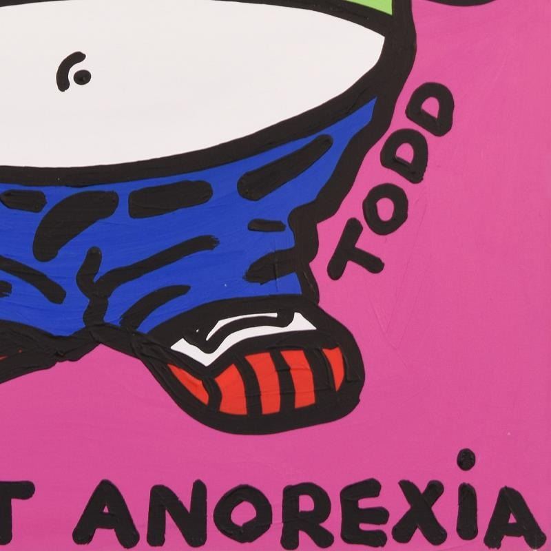 "Beat Anorexia" is an original acrylic painting on gallery wrapped canvas by Todd Goldman, hand signed by the artist. Includes Letter of Authenticity. Measures approx. 24" x 36" (image). Due to the way this piece was stored there may be minor wear or signs of age (such as wear on the corners) but the piece is in overall good condition.