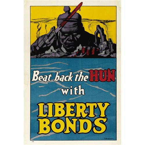 <B>Beat Back The Hun.</B></I> 20" x 30" Artist: F. Strothmann. Printed for the Fourth Liberty Loan. One of the most compelling and gruesome images of World War I propaganda, this poster shows a bloodthirsty Hun, looking over war-torn Europe and across the Atlantic to America. He is fully equipped with his Pickelhaube helmet and ape-like countenance. Amusingly, the Germans would adopt this ape-like image to depict the Bolsheviks in their propaganda posters. This is a fantastic poster, using the most derogatory kind of propaganda. Most of the Liberty Bond posters were inflammatory, but highly effective. Americans would purchase more than $23 billion worth of bonds to help the war effort. <BR><BR>Condition: Fine- edges soiled and stained slightly; linen backed.