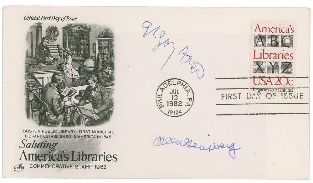 FDC with a cachet honoring American libraries, signed on the front in blue ballpoint by Allen Ginsberg and Gregory Corso. In fine condition.