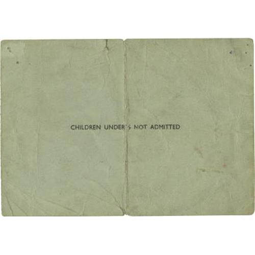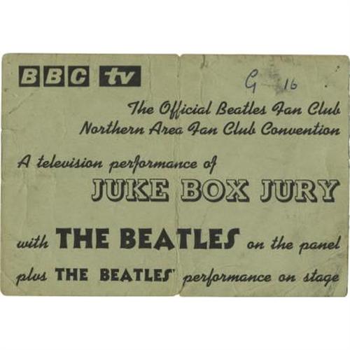 <B>Beatles "Juke Box Jury" Ticket.</B></I> A used ticket from the band's December 7, 1963 appearance on the show's judging panel, in Very Good condition with some heavy creasing.<BR><BR><b>Shipping:</b> Flat Material, Small (<a target="_blank" href="http://www.heritageauctions.com/common/shipping.php">view shipping information</a>\)