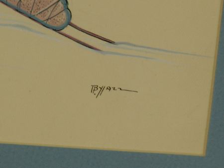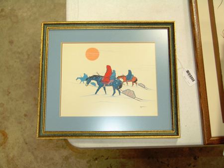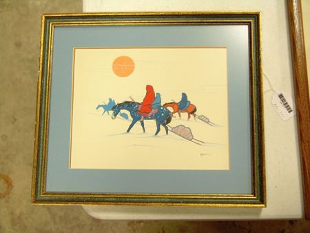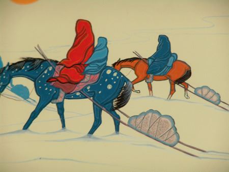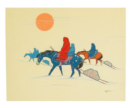 Ca. 1980s, Fine signed original gouache on paper depicting families traveling in the snow pulling travois. Very good condition. 8" x 10" (12" x 14" framed)