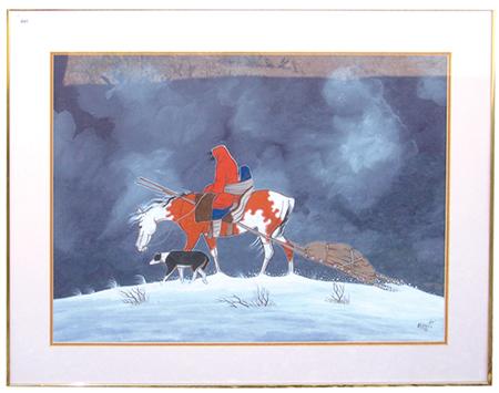 "Winter Mare" watercolor depicting mother and child pulling travois in snow with dog. 25-1/2" x 32-1/2" (19-1/2" x 26")