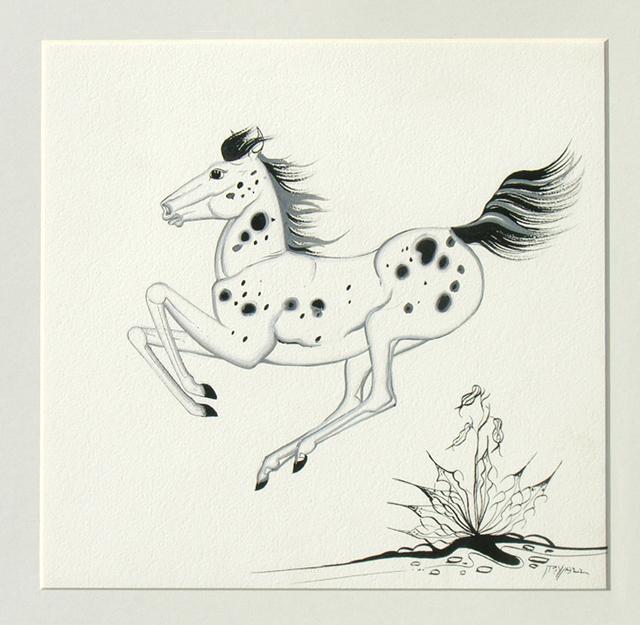 Circa 1970, Two tone watercolor in black and grays of Running Spotted Pony - matted and framed. 11" x 11" (17" x 17" framed)
