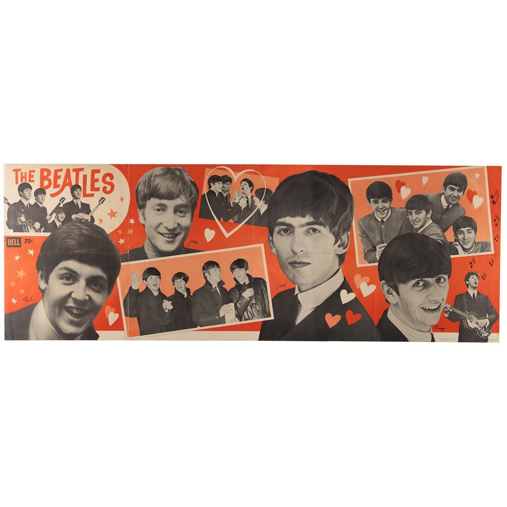 Large red, black, and white poster of The Beatles published in the U.S.A. by Dell, 53 x 18.75, featuring huge headshots of each band member as well as several group photos. Folded as issued and in very good to fine condition, with small tape stains and tack holes to the corners.