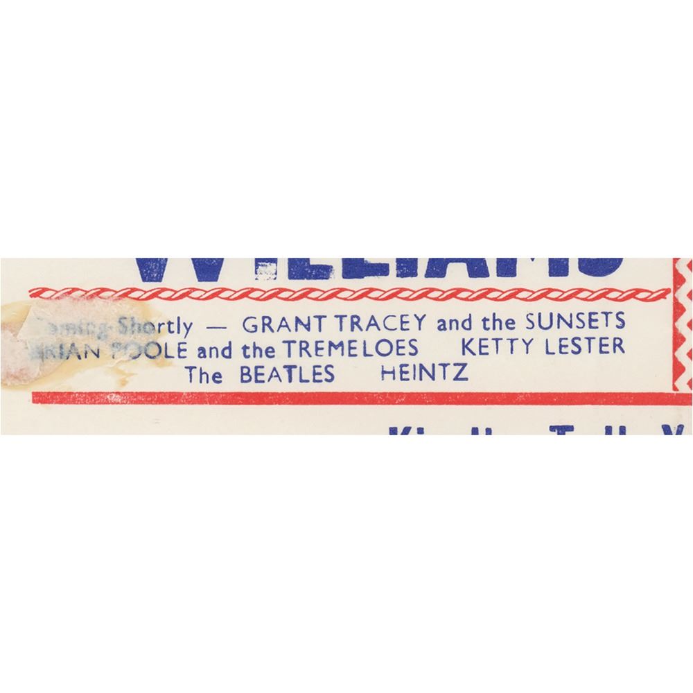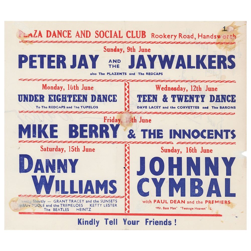 Rare original color 8.25 x 7 handbill promoting six concerts at the Plaza Dance and Social Club on Rookery Road in Handsworth, Birmingham, between June 9 and 16, 1963, with the lower left featuring a ‰ÛÏComing Shortly‰Û section that mentions the Beatles. The handbill lists concerts for acts like Peter Jay and the Jaywalkers, Danny Williams, Johnny Cymbal, and Mike Berry and the Innocents. In very good to fine condition, with some stains, creases, areas of thin paper, and a chip to the right edge. The Beatles played two shows on July 5, 1963, the first at the Plaza Dance and Social Club, and then later at the Plaza Ballroom in Old Hill.