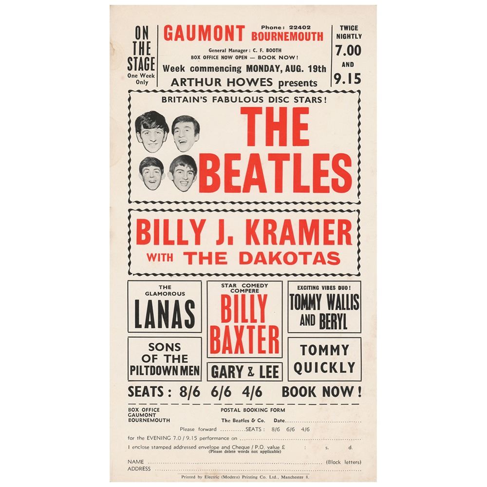 Scarce original color 5.75 x 10.25 handbill for a series of concerts by the Beatles at the Gaumont Theatre in Bournemouth, England, starting on August 19, 1963, and concluding on August 24, 1963. Also listed on the handbill are Billy J. Kramer with the Dakotas, the Lana Sisters, Billy Baxter, Tommy Wallis and Beryl, Sons of the Plitdown Men, Gary & Lee, and Tommy Quickly. In fine condition. Accompanied by a certificate of authenticity from Tracks, and by three promo cards for the Lana Sisters.