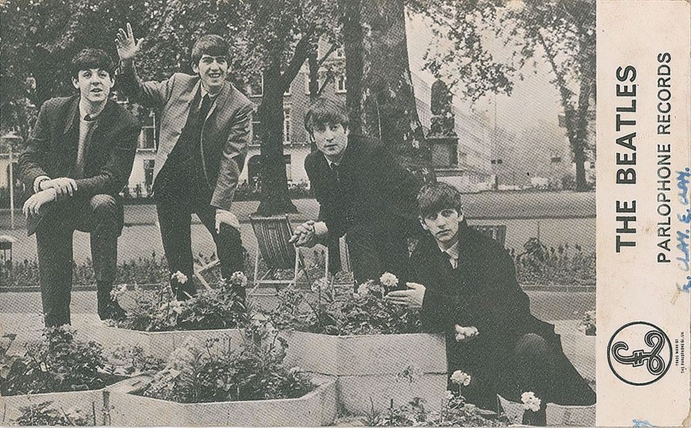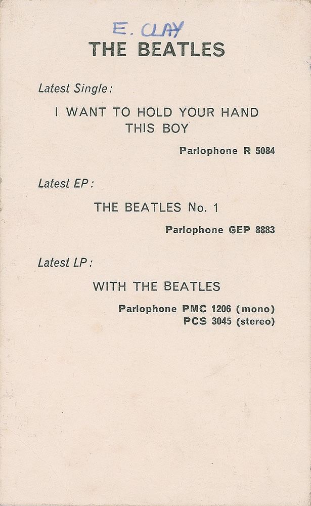 Circa 1963 Parlophone Records promo card for the Beatles, 5.75 x 3.5, with front featuring an image of the group posing in a small London garden, taken by Dezo Hoffmann in July 1963 for a feature in the Liverpool Echo newspaper. Reverse lists the band’s latest single, ‘I Want to Hold Your Hand / This Boy,’ EP, ‘The Beatles No. 1,’ and LP, ‘With the Beatles.’ In fine condition, with small owner's notations to both sides. Accompanied by a certificate of authenticity from Tracks.