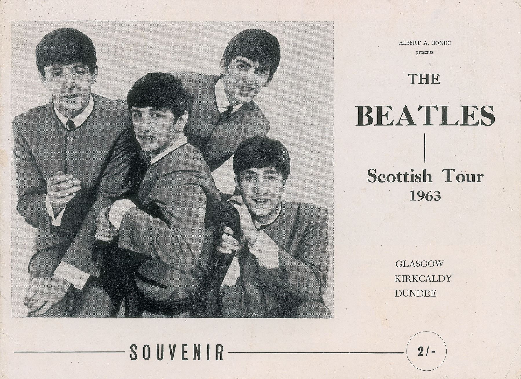 Rare original concert program for the Beatles’s three-date mini-tour of Scotland in October 1963, seven pages, 9.75 x 7.25, with the Beatles featured prominently on the front cover and on the centerfold, which bears the header: “Britain’s Most Exciting Vocal and Instrumental Quartet.” Printed by Moravian Press and published by Albert E. Bonici, the program also features images and information for supporting acts The Caravelles, Malcolm Clarke and the Cresters, Johnny Hudson and the Teenbeats, and more. The Beatles played in Glasgow, Kirkcaldy, and Dundee on consecutive nights from October 5th to the 7th. In very good to fine condition, with handling wear, some light staining, and a subtle central vertical fold. Accompanied by a certificate of authenticity from Tracks.