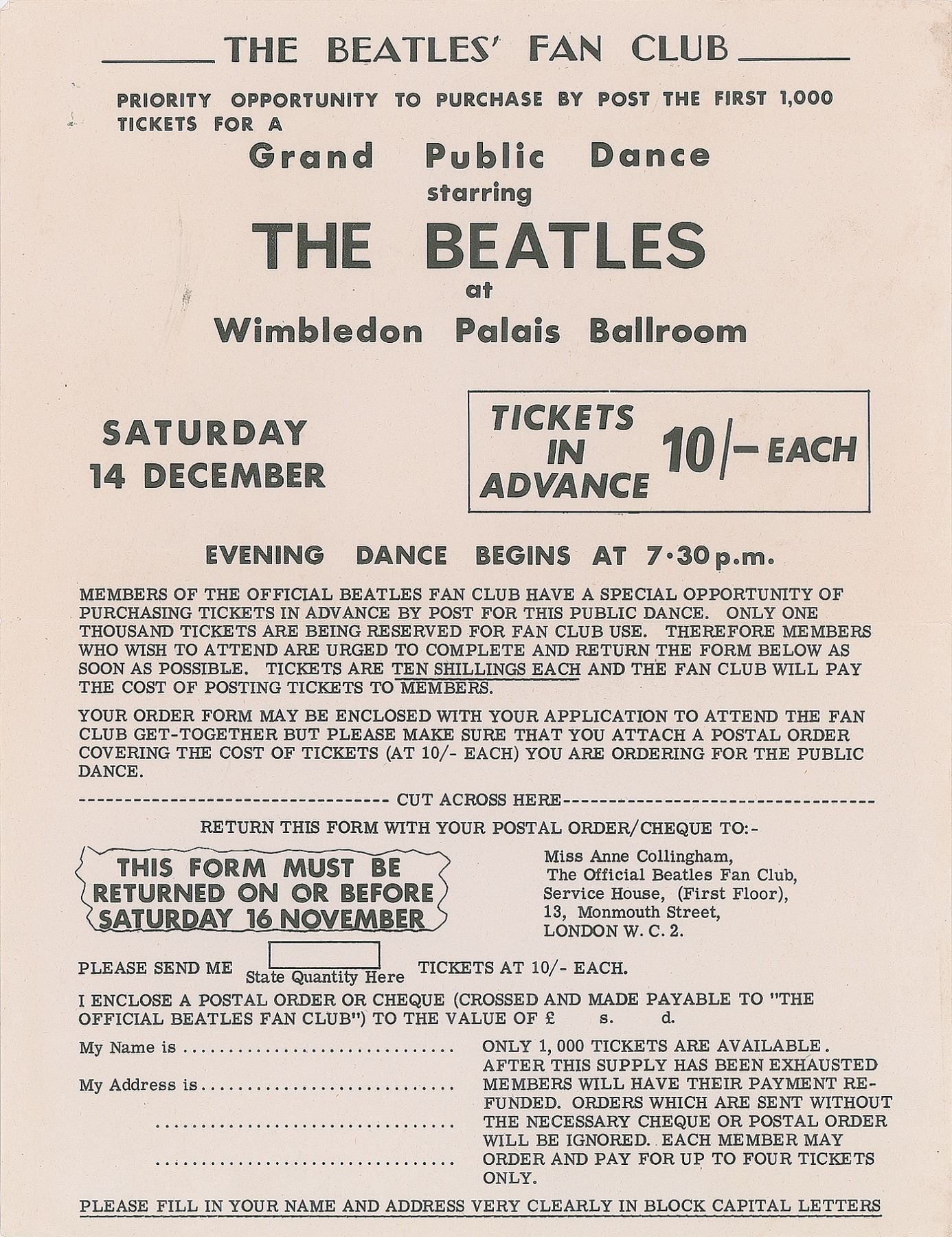 Rare Beatles’ Fan Club flyer offering members “priority opportunity to purchase by post” the first 1,000 tickets for a “Grand Public Dance starring The Beatles” at Wimbledon Palais Ballroom on December 14, 1963, measuring 8.5 x 11, with postal form still attached. In fine condition, with intersecting folds and light handling wear. Accompanied by a certificate of authenticity from Tracks. Fearing damage to the stage from ravenous fans afflicted with Beatlemania, the Wimbledon Palais management built a separate performance platform surrounded by a steel cage to separate the crowd from the band.