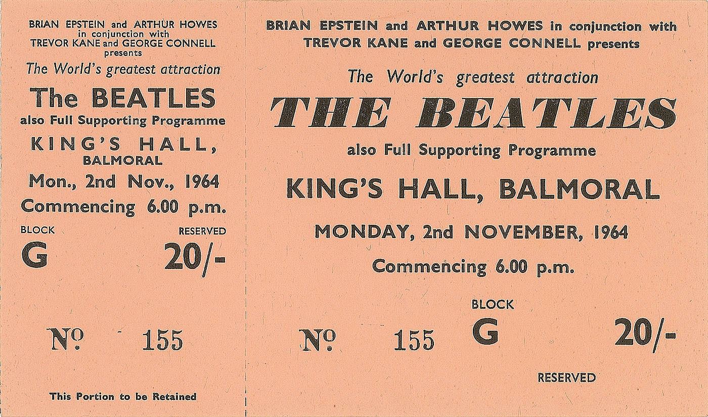 Complete unused 6.25 x 3.75 ticket for "The World's greatest attraction, The Beatles," at King's Hall, Balmoral, Belfast, on November 2, 1964. The salmon-colored paperstock ticket is marked "No. 155, Block G." In very fine condition. Accompanied by a certificate of authenticity from Tracks.